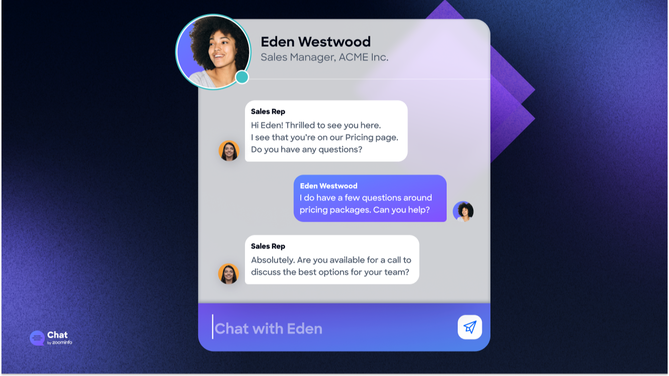 ZoomInfo Chat enables businesses to greet website visitors armed with ZoomInfo Intelligence for informed and tailored conversations that convert.