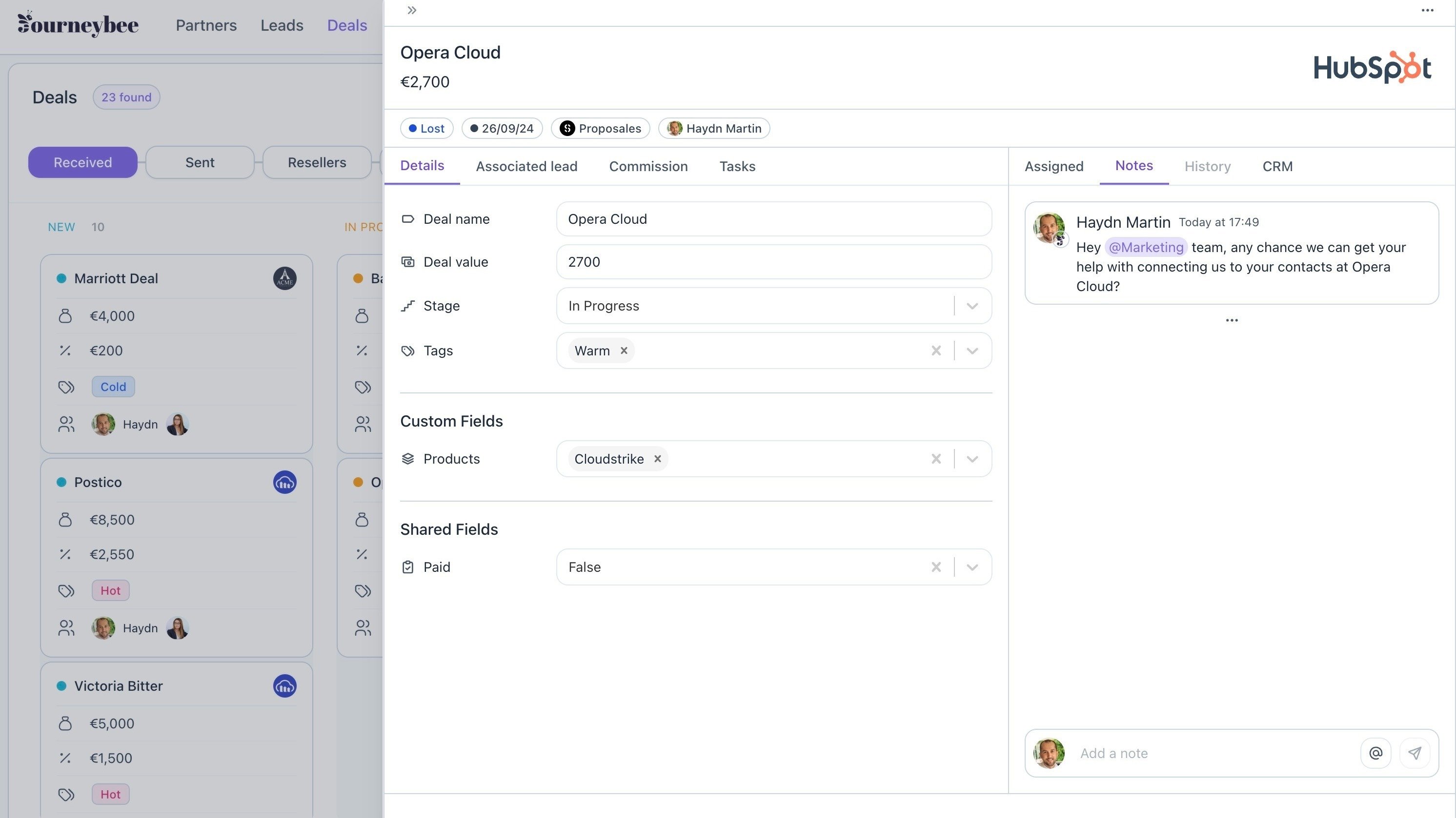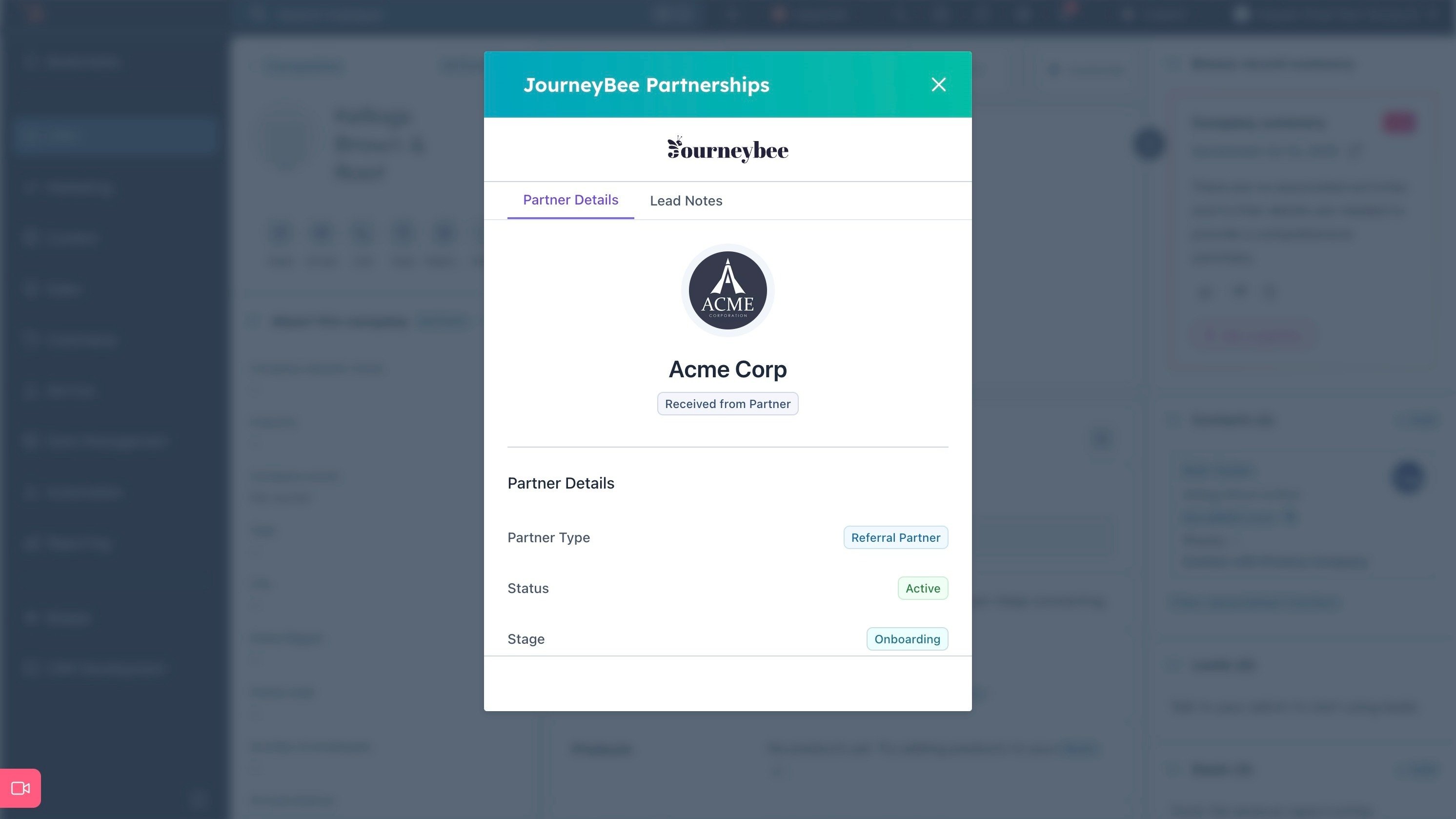 HubSpot Widget: Embed the Journeybee Partnerships card within HubSpot record views to view partner details, send leads, and communicate on deals without leaving HubSpot.