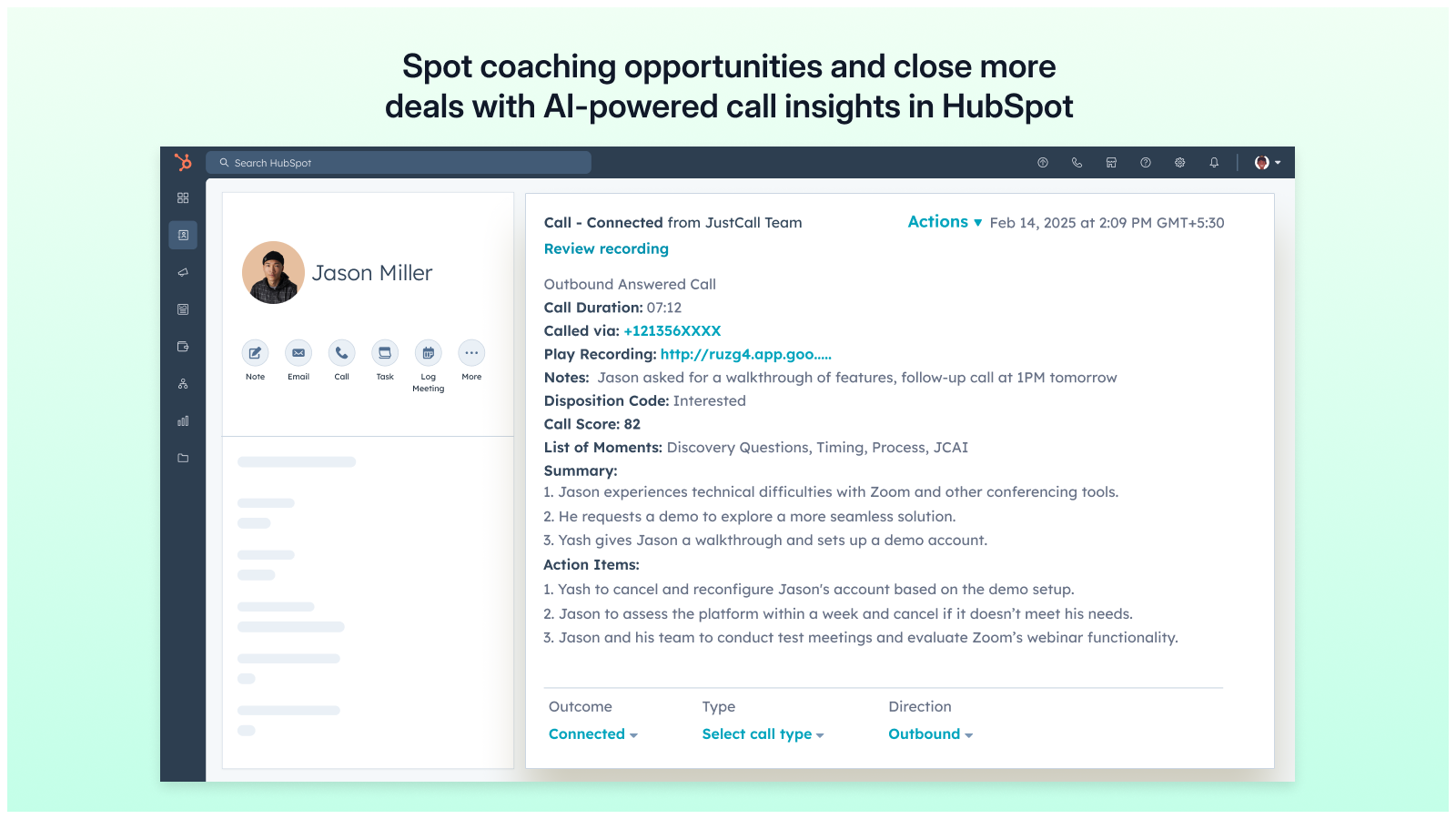 Connect: Call and text prospects in a click directly from HubSpot. Automatically log every interaction with AI call summaries and action items for smart follow-ups.