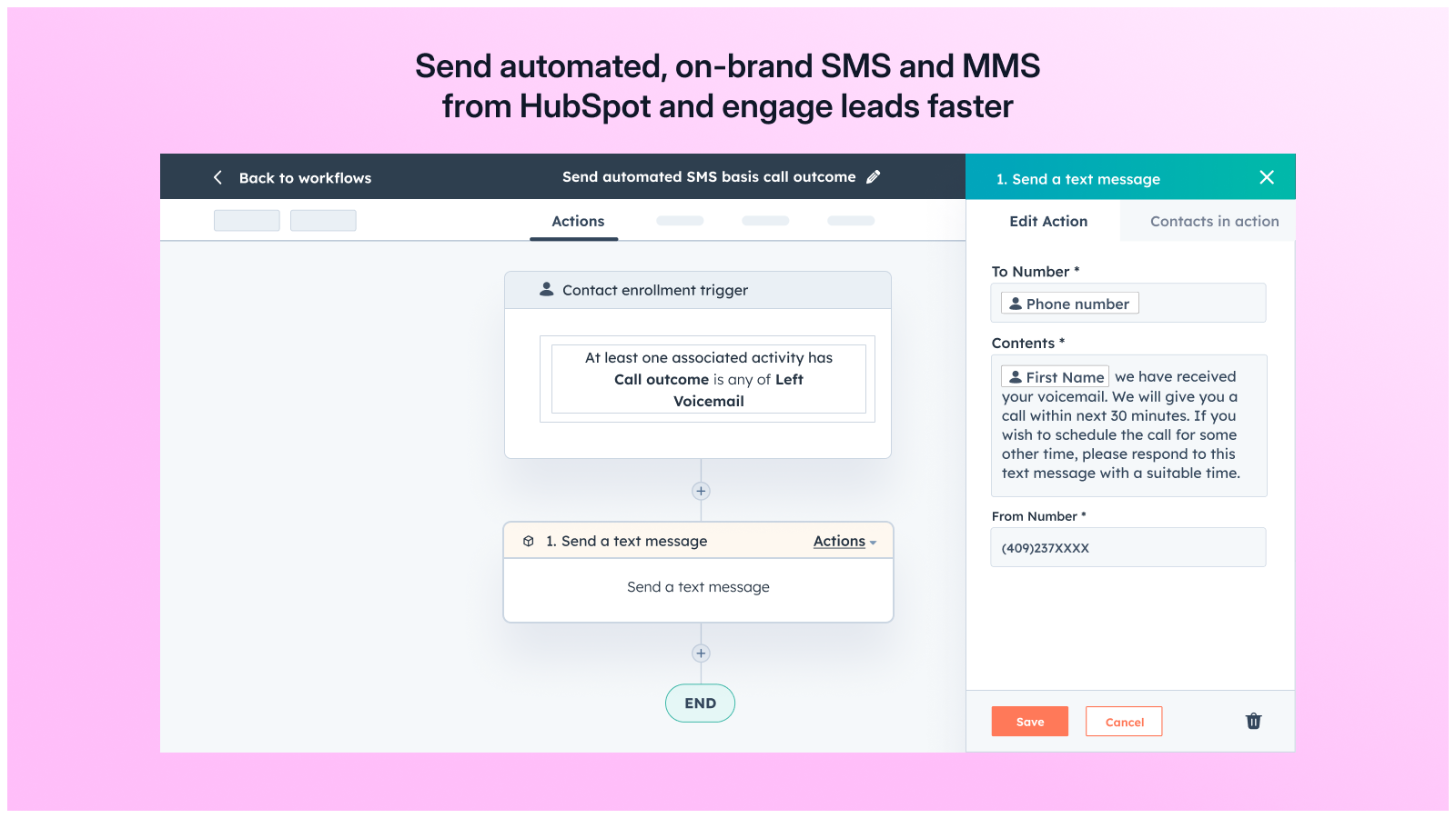 Automate follow-ups and engage customers via text and multimedia messages with workflow automation in HubSpot. Better engagement. Higher CSAT.