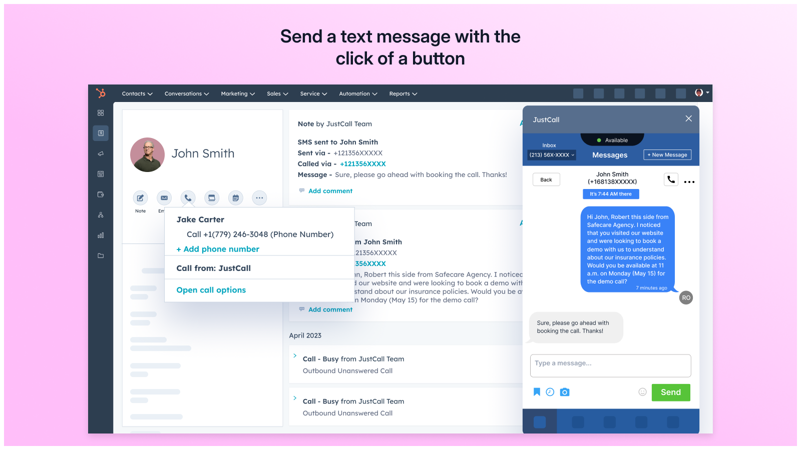 Logging of SMS message threads in HubSpot so that they're visible to all staff in real time. Automated quick replies (SMS) and voicemail drops save time