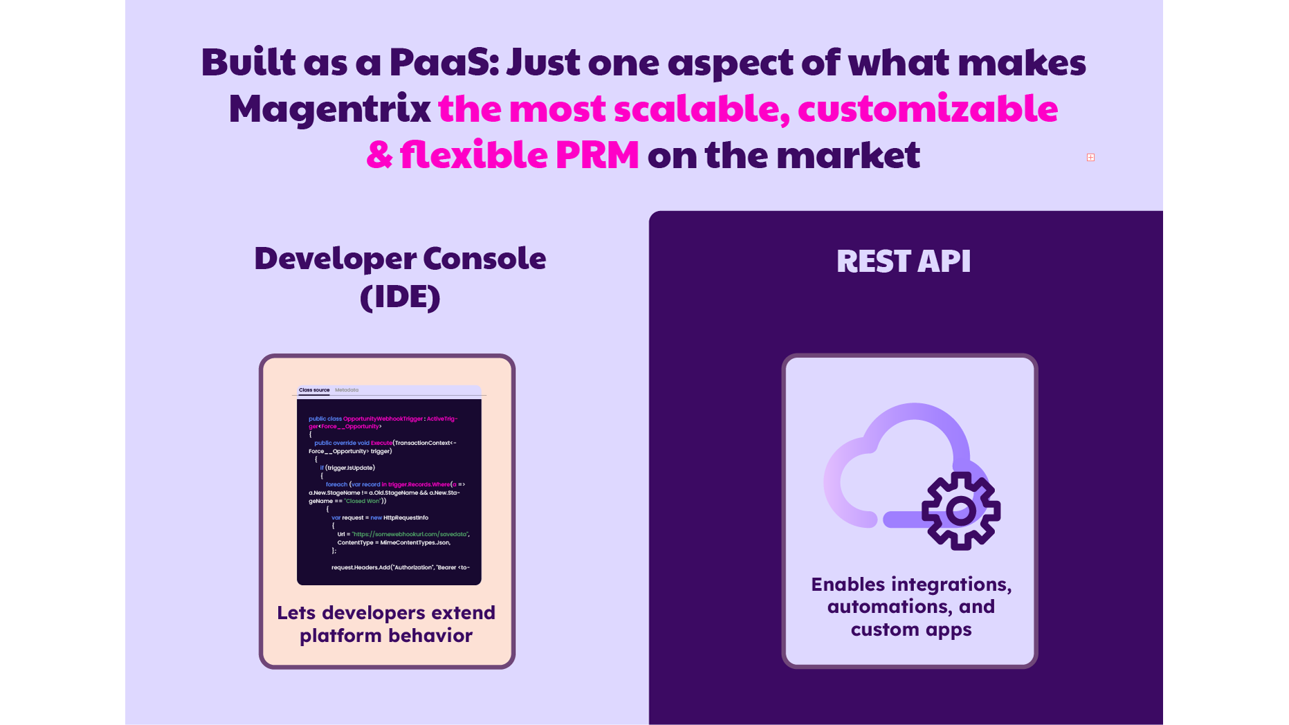 Magentrix is the only PRM besides SF that is a platform as a service (PaaS). This means you can build on top of the existing PRM that comes out-of-the-box. ✅ Flexibility to architect your partner operations tech as you see fit ✅ Design and personalize the PX on the partner portal ✅ Never worry about scalability or growing partner management needs.