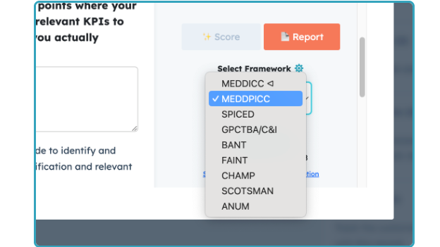 Meddicc Score supports a wide range of sales qualification frameworks, including MEDDICC, MEDDPICC, BANT, GPCTBA/C&I, SPICED, FAINT, CHAMP, SCOTSMAN, and ANUM. Frameworks can be customized to align with your sales process and preferred questions.