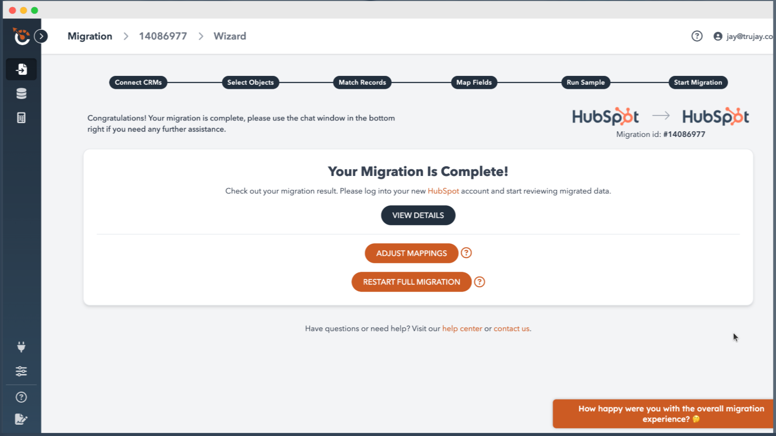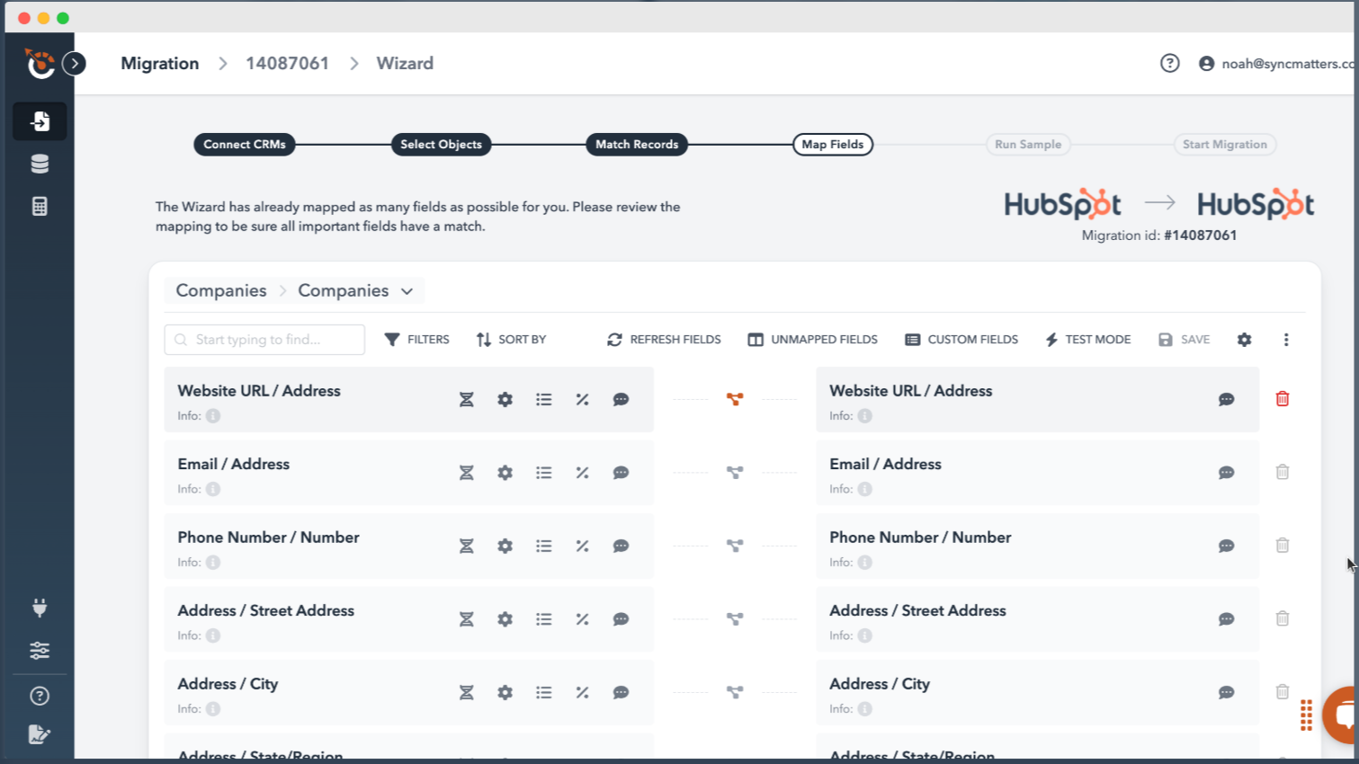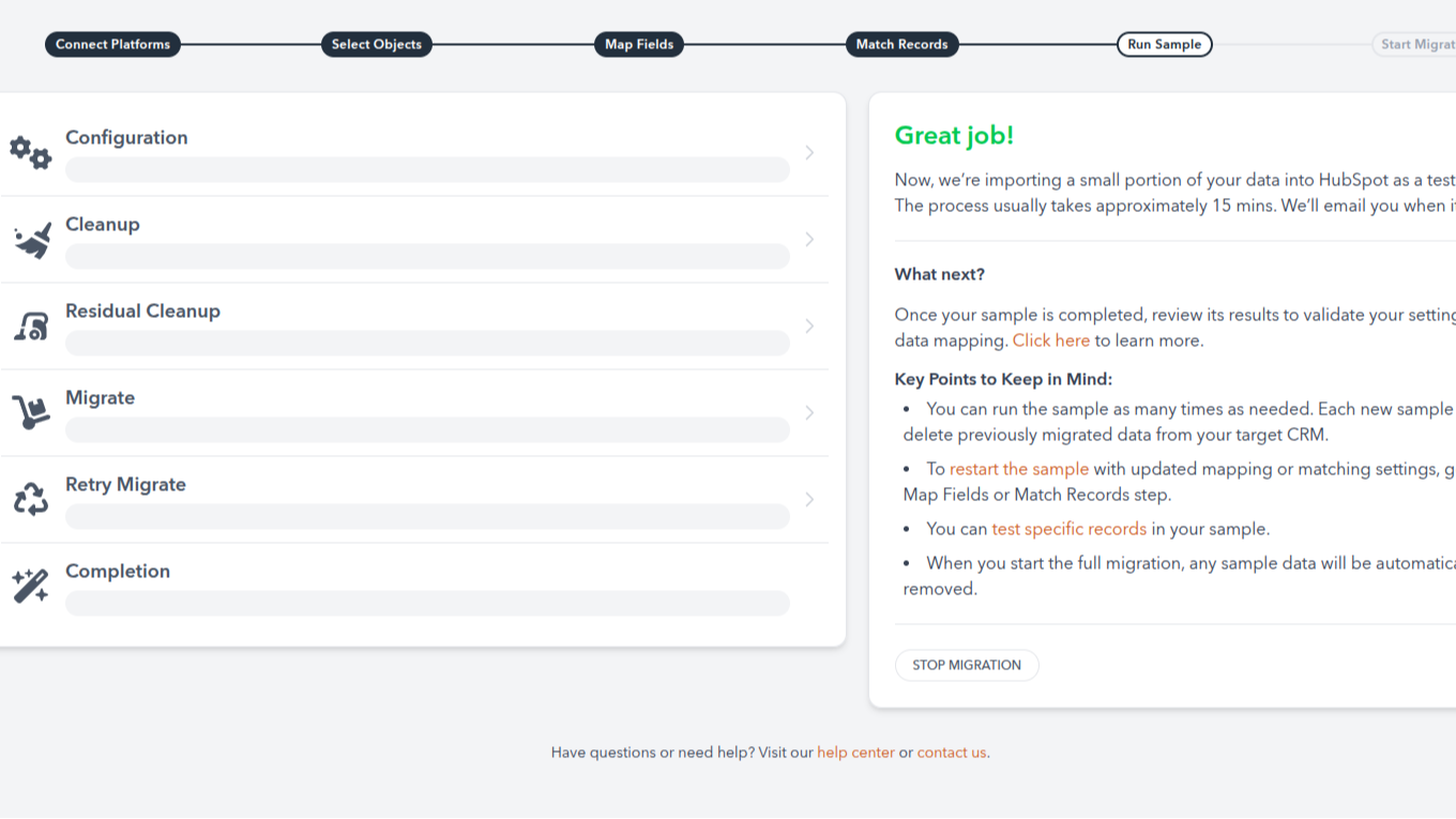 After connecting the systems, we'll auto-map your objects and fields. Then, MigrateMyCRM takes ~10% of your records and migrates them into HubSpot. Run these as many times as you need. It's free. (Each time you run a sample, we'll automatically remove the previous one, allowing you to run a fresh test.)