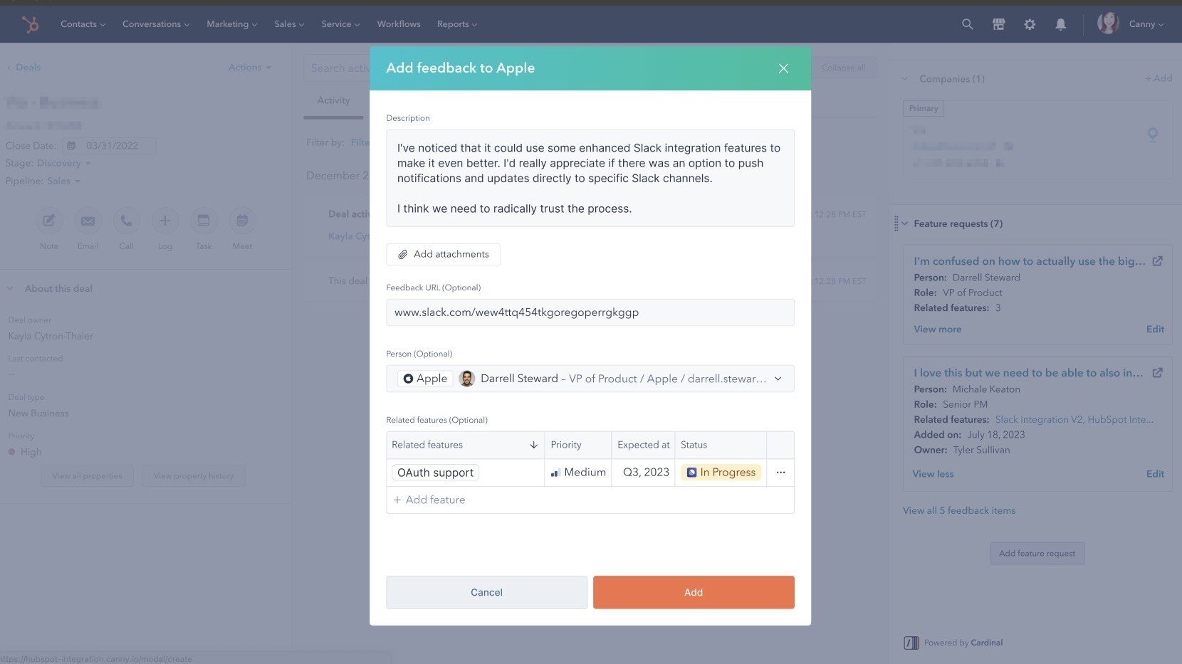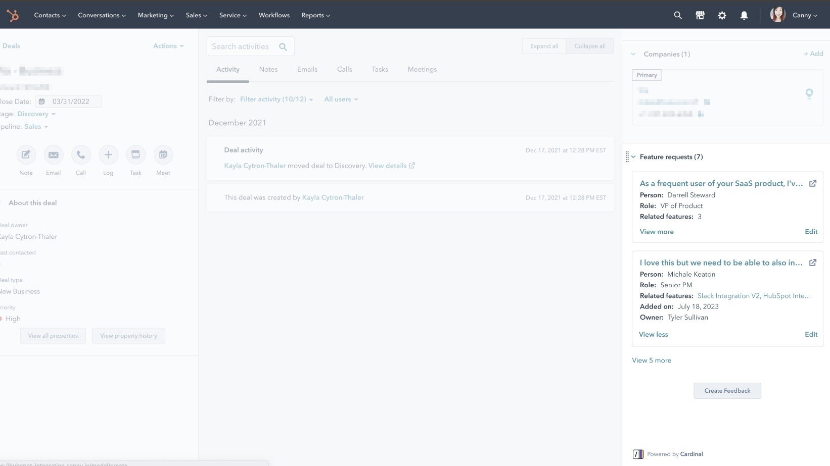 Once you connect your HubSpot to Miro Insights, you can manage your prospects and customers' feature requests in Miro Insights and see the feature requests and their statuses in a dedicated panel in HubSpot.