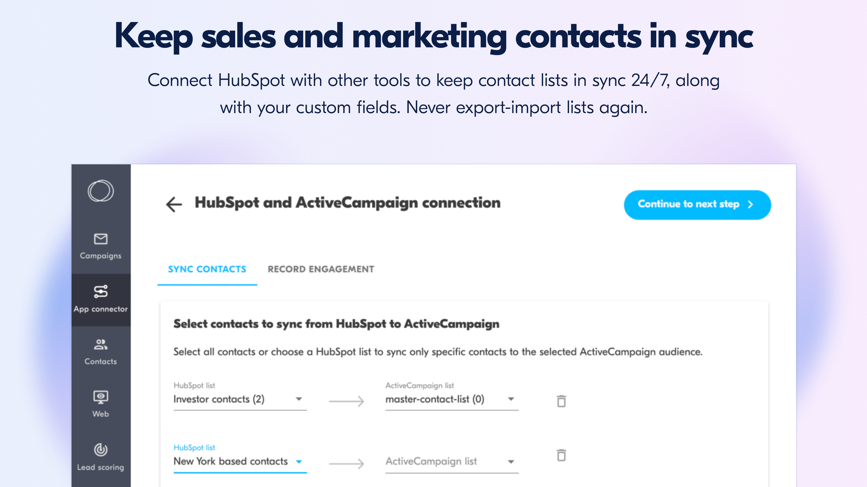 Keep contacts in 2-way sync between HubSpot and marketing platforms like Mailchimp, Klaviyo, Brevo, and ActiveCampaign. Powerful field mapping, easy to monitor syncing progress.