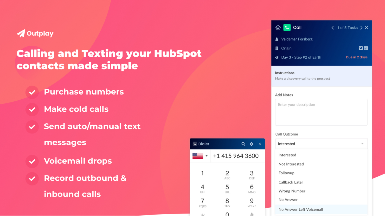 Outplay helps to reach out to your HubSpot contacts with the multi-channel outreach platform. All the activities, notes, and comments will be synced back to HubSpot seamlessly.