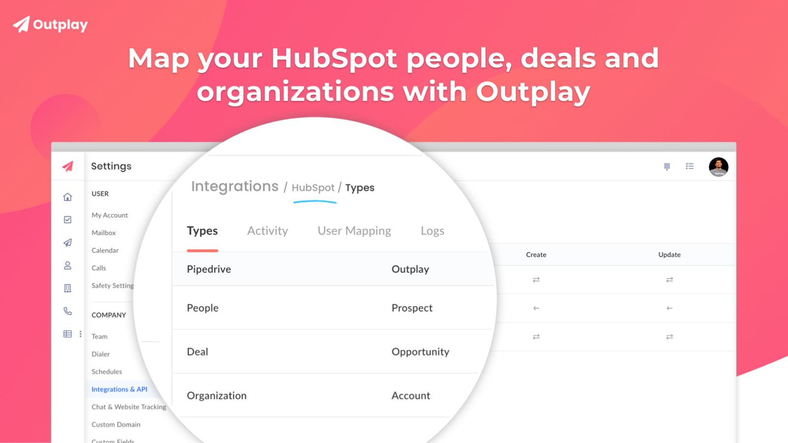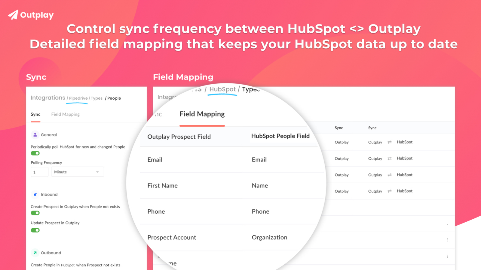 Bi-directional sync between Outplay and HubSpot makes it easy to have consistent data across both platforms. Contacts, Deals, Organization objects can be mapped and configured for two-way sync.