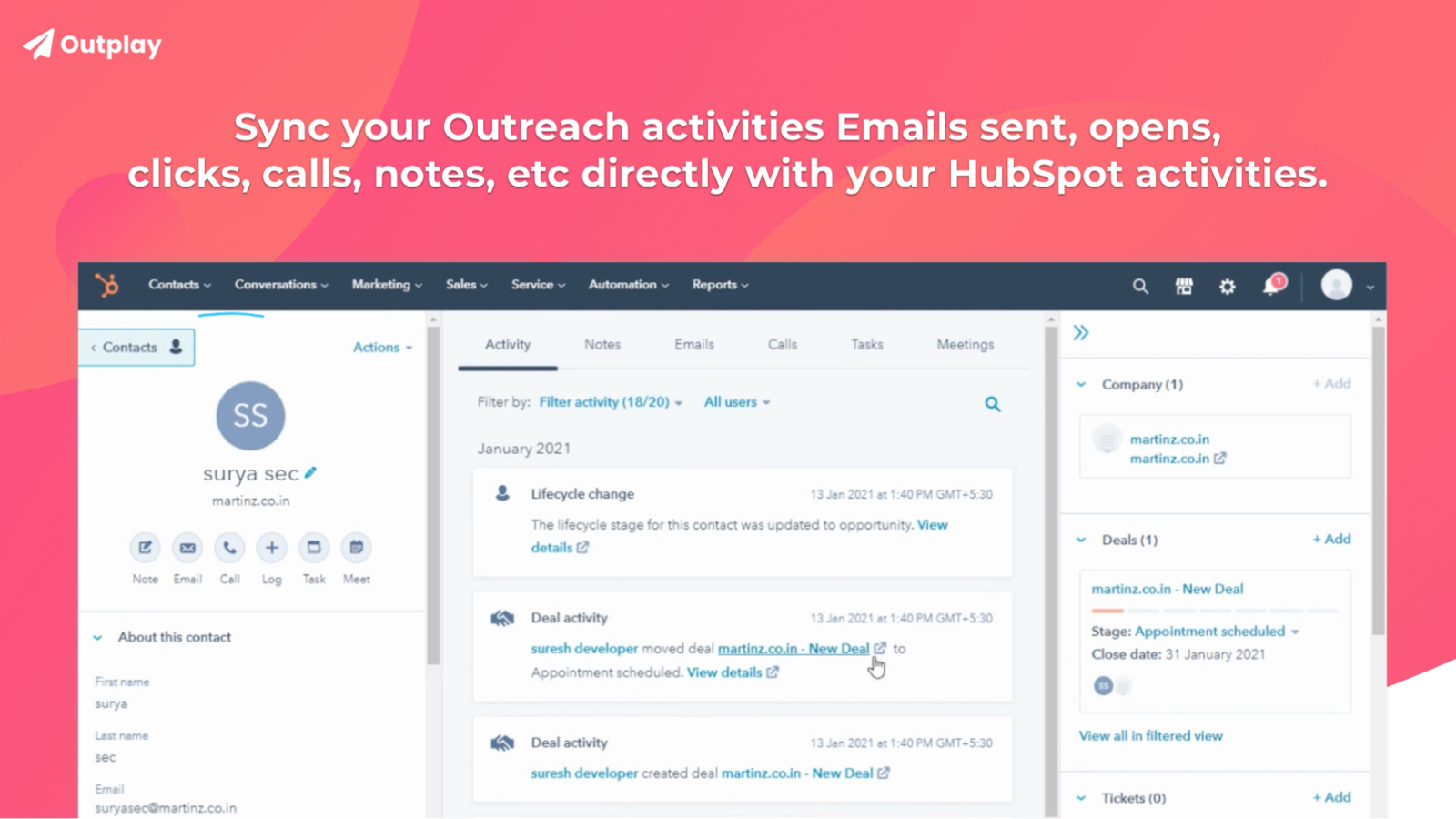 - Auto-sync Outplay activities with HubSpot - Sync all the Outplay activity data like call notes, email opens, clicks, replies, meetings booked directly to your HubSpot records so you can nurture your prospect even more intelligently.