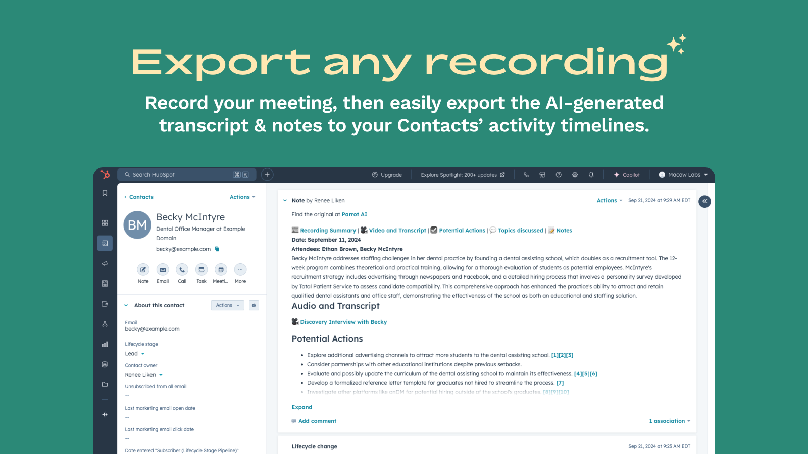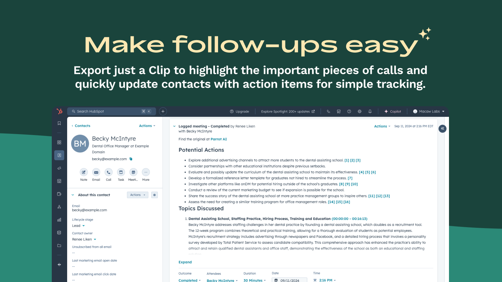 Parrot AI turns conversations into results by annotating key moments in each recording that discuss action items, and then provides a summary of what needs to be done and by whom. Export specific clips from Parrot AI to HubSpot to include only the most relevant information for a particular Contact.
