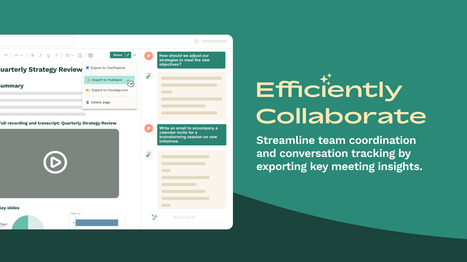 Need to reference exactly what was said in a meeting? Parrot AI safely and securely records all your meetings and automatically generates a video-rich, interactive page that you can then export directly to HubSpot. You can manually upload any recording, or record using our Meeting Assistant in Zoom, Google Meet, Teams or Webex.