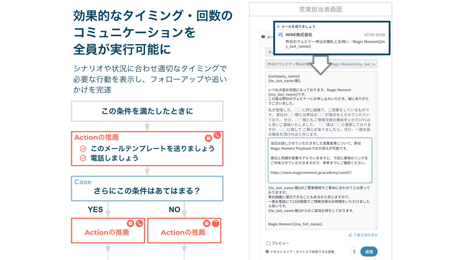 営業担当者と顧客とのエンゲージメントの変化(どういう合意を行なったのか、どれくらいの時間が経過しているのか等)に応じて、自動でメールの送信する(自動・半手動が選択できます)、電話などの実施すべき行動をサジェストするといったことができます。