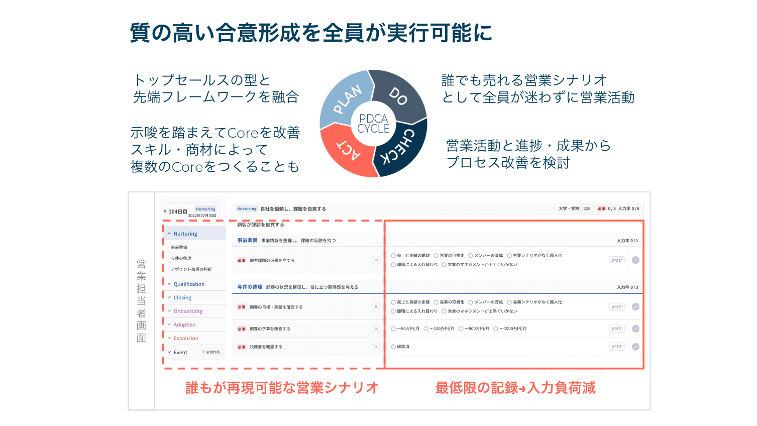 トップセールスの営業の型と最先端の営業フレームワークを融合した Playbook Core を使い、誰もがトップセールスと同様に顧客と合意形成を行うことを可能にします。