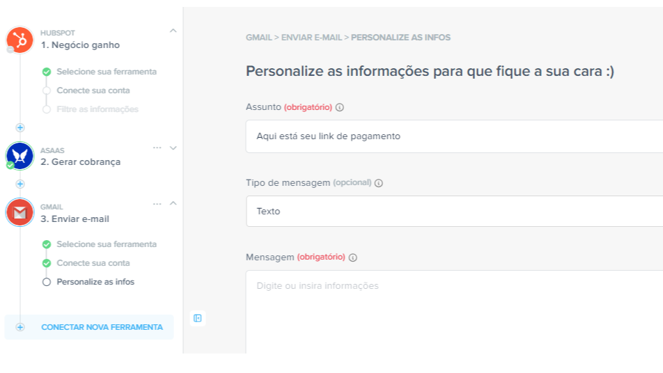Conecte facilmente suas ferramentas e automatize fluxos de trabalho sem escrever nenhuma linha de código. Basta selecionar suas ferramentas, mapear as informações e deixar o resto com a Pluga. Feita para todos os níveis de conhecimento técnico!