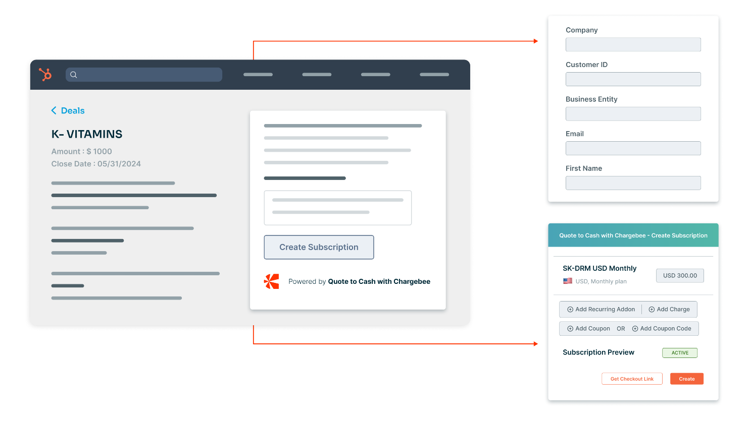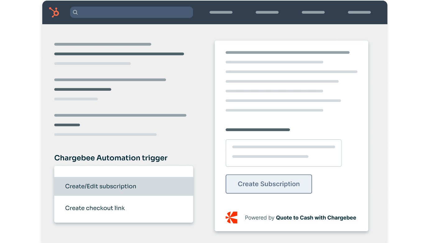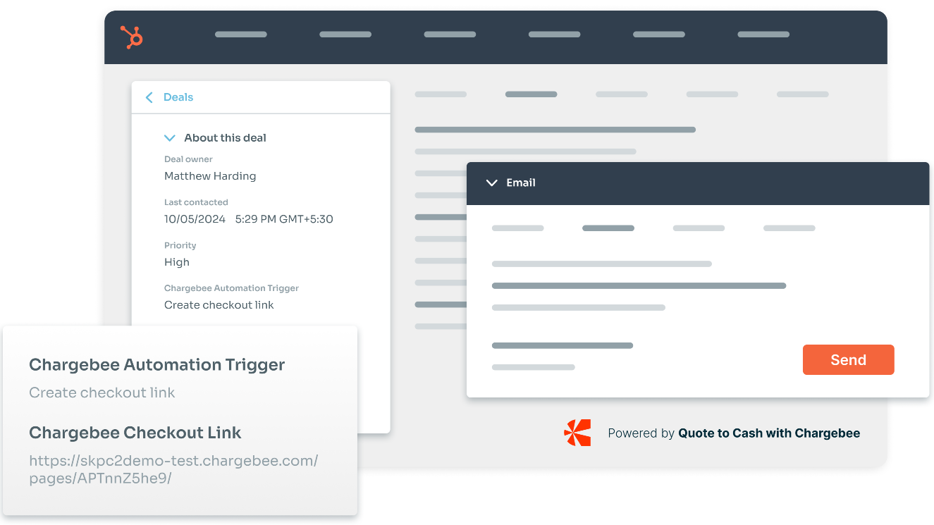 Using Chargebee's automation triggers, create a checkout link for non-recurring items like onboarding or setup fees. Once payment is completed, a subscription is created, and the information is updated in the deal history. Enhance this further by automatically triggering an email with a payment link when the deal is marked "closed-won."
