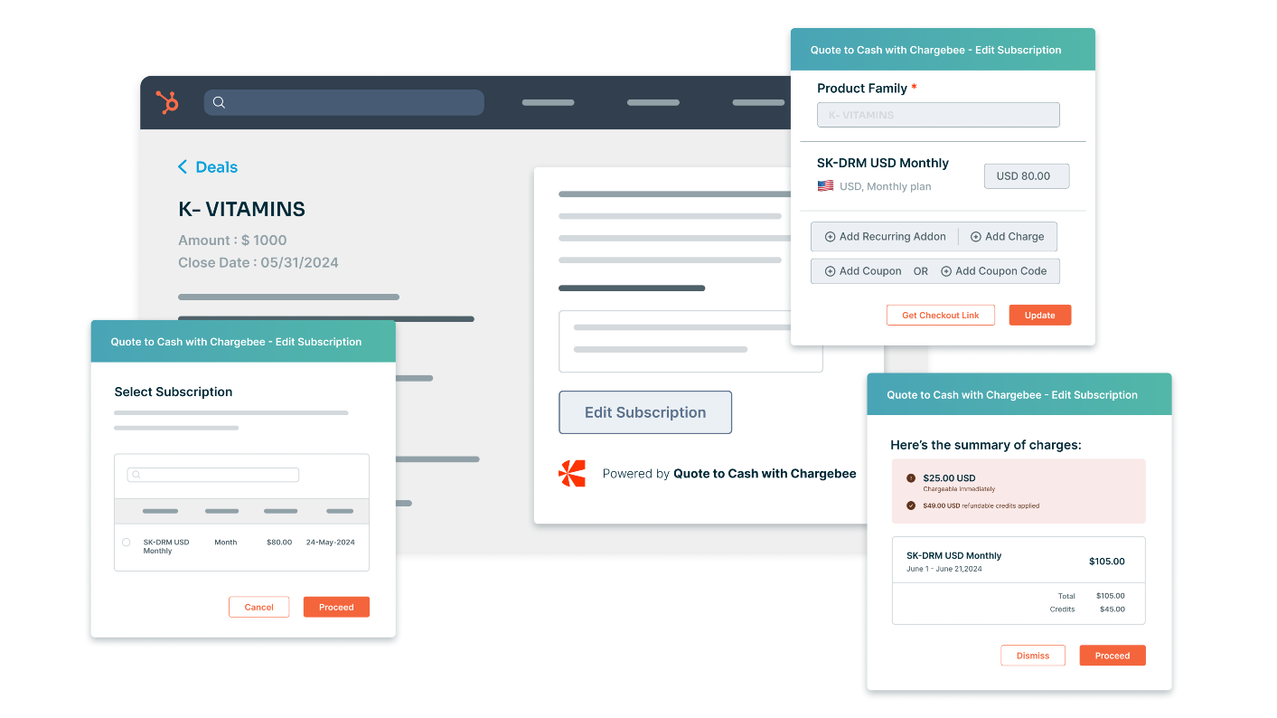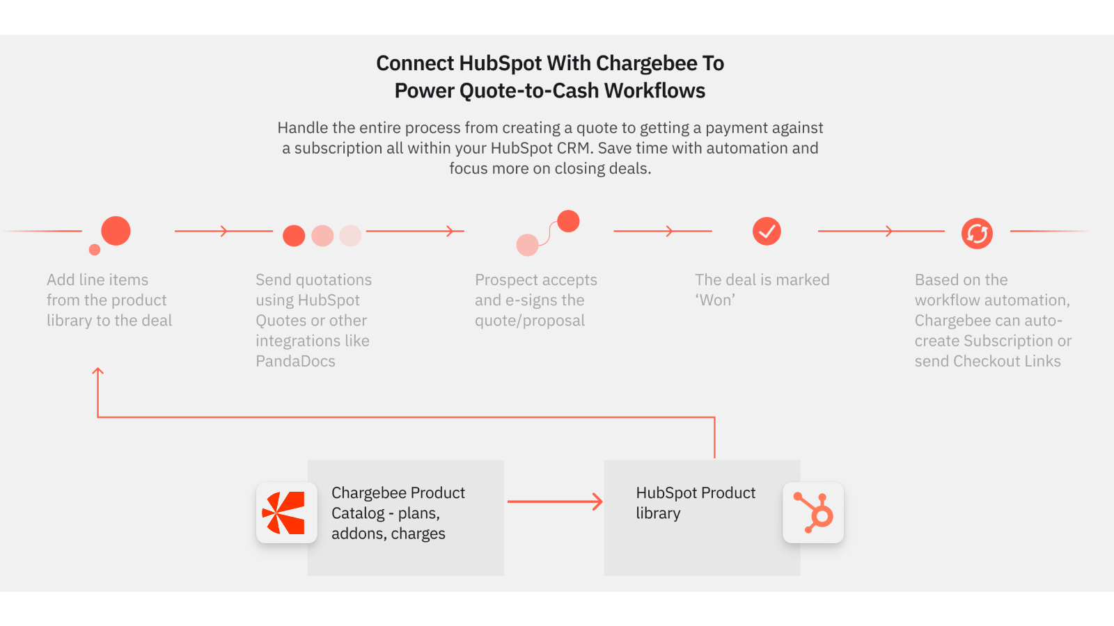 Chargebee's HubSpot Q2C integration simplifies this by allowing sales reps to create quotes and subscriptions directly from a pre-synced Chargebee product catalog within HubSpot. They can choose between automatic checkout links triggered by workflows or manually adding deal line items for customized quotes, eliminating the need for involvement from finance or operations teams. This ensures that only approved plans and prices are used, preventing unauthorized discounts. Customer success teams can also upsell higher plans or add-ons directly within HubSpot using the new subscription amendments functionality. This makes HubSpot the centralized platform and a single source of truth for all your GTM teams, promoting a more efficient sales cycle from quote to cash.