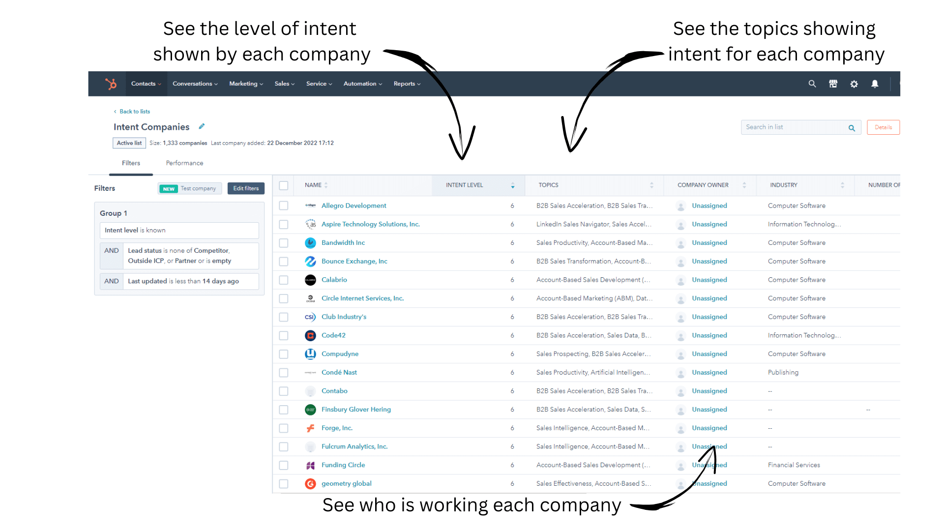 The integration allows you to bring intent data right into your day-to-day sales and marketing processes. From highlighting which companies should be acted upon by sales through to automatically triggering advertising or email marketing to contacts or companies identified as showing intent.