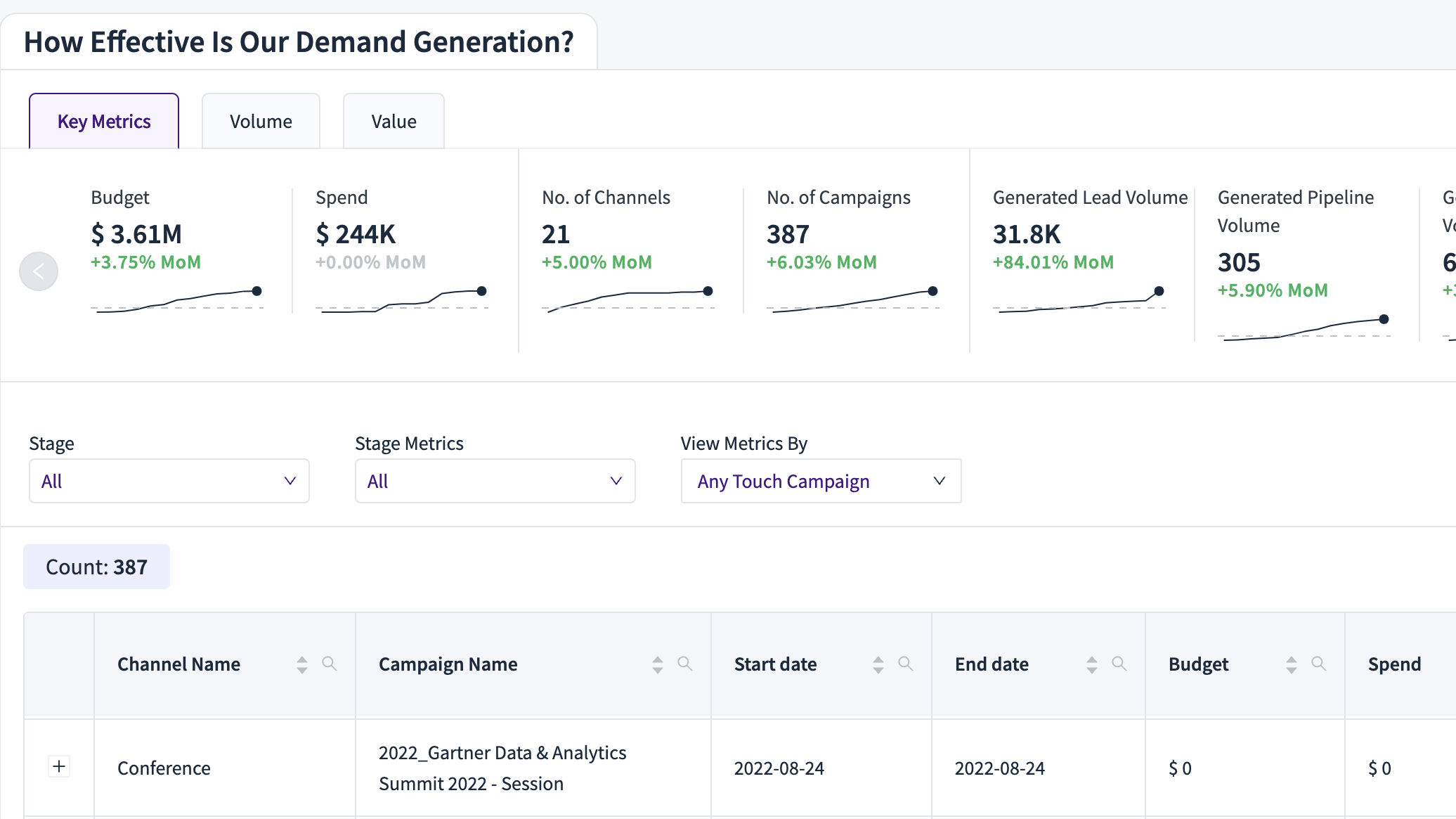Compare marketing and sales funnel views so you can better understand how to partner together to generate pipeline at scale. Engage in strategic conversations with sales to align GTM priorities based on the state of your funnel.