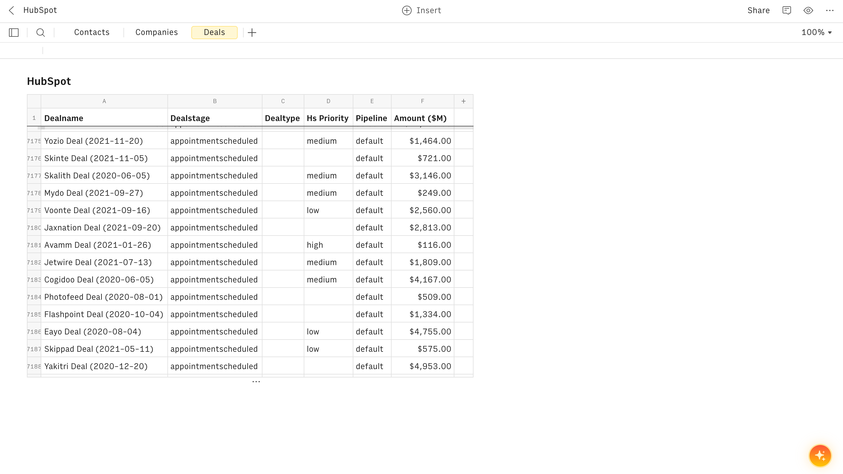 Connect Rows to HubSpot to retrieve, add, edit, and remove deals directly from your spreadsheet. Track pipeline data, update deal properties, manage deal stages, and keep revenue forecasts accurate, all without leaving Rows.