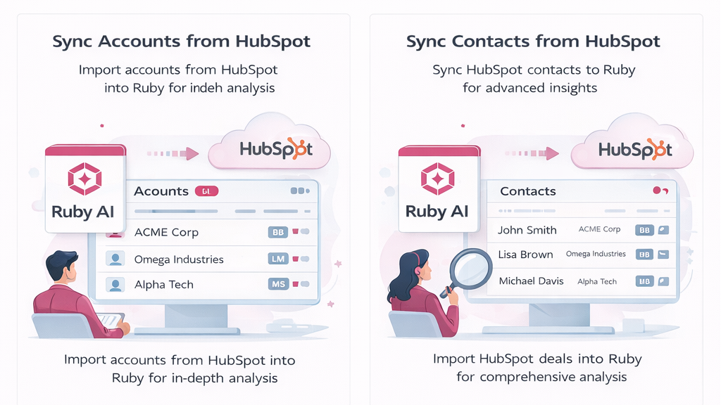 Ruby brings AI-powered sales intelligence directly into your HubSpot workflow. The Ruby integration for HubSpot automatically syncs your CRM data, Companies, Contacts, and Deals into Ruby's AI-powered sales intelligence platform. Once connected, your team gets continuous AI analysis of deal health, engagement patterns, and actionable next steps, all powered by the data already in your HubSpot CRM.