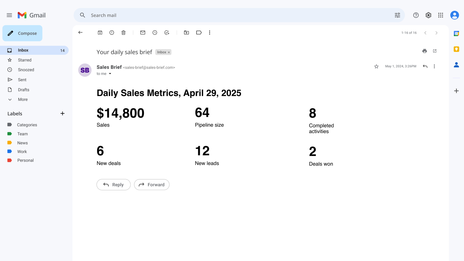 Sales Brief is a lightweight daily digest designed for sales reps who want to stay on top of their sales metrics without wasting time digging through reports and dashboards. Sales Brief connects directly to your HubSpot account and delivers a clear, focused snapshot of your performance every morning.