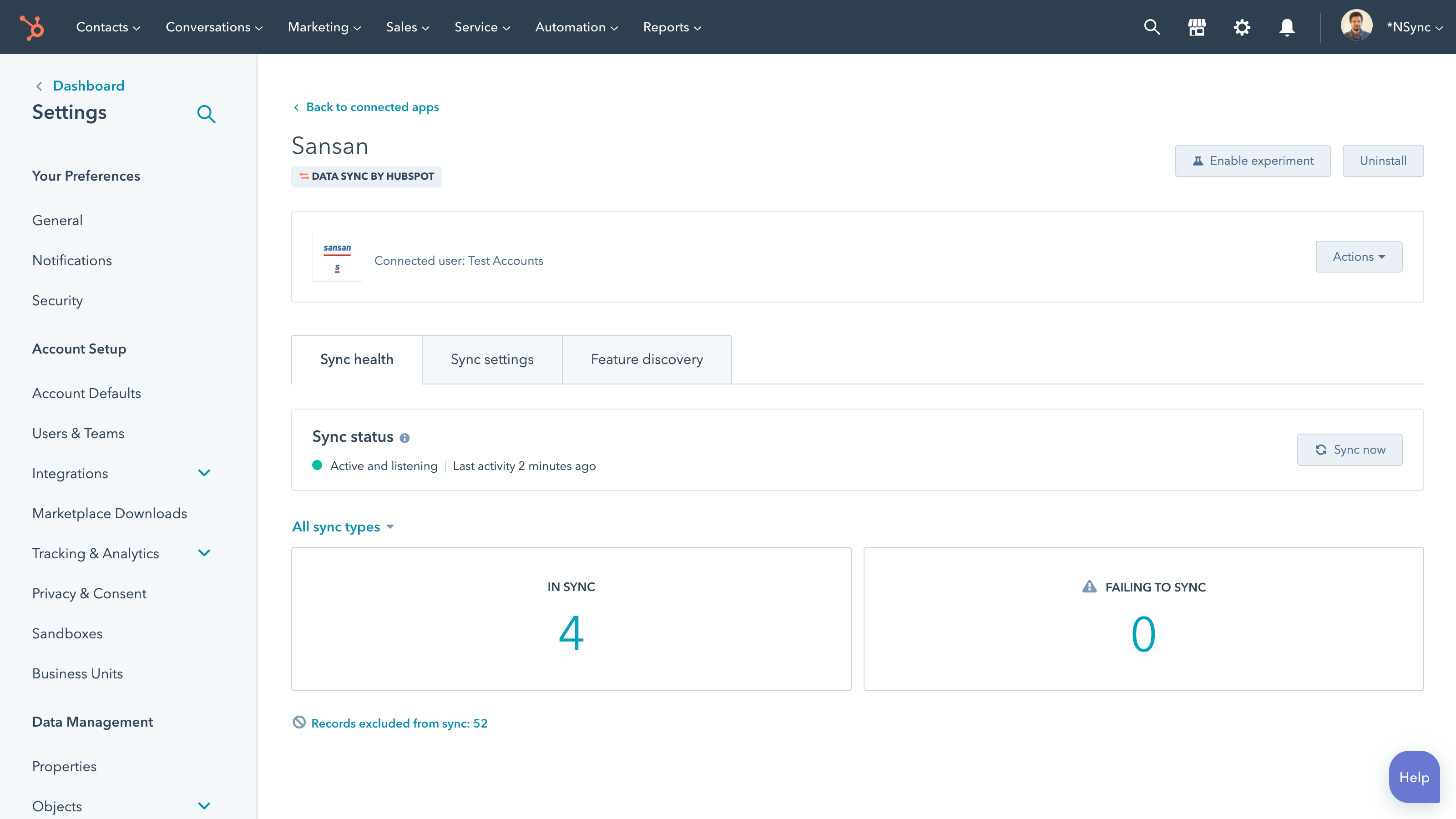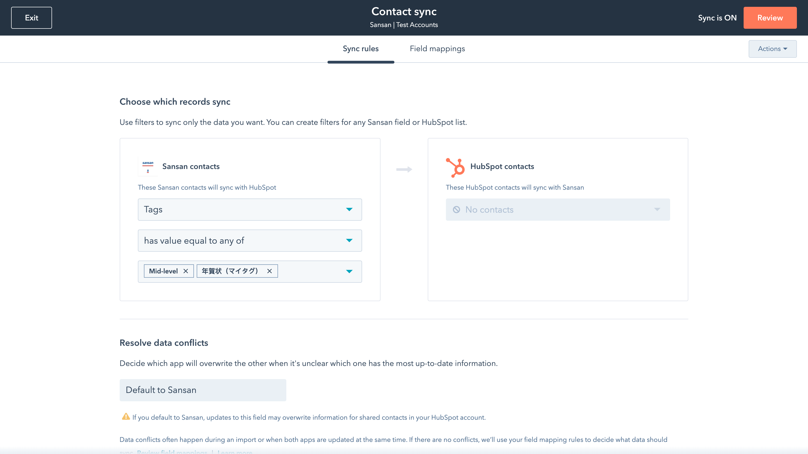 One way sync: Data is shared between Sansan and HubSpot in near real time (every 5 minutes)