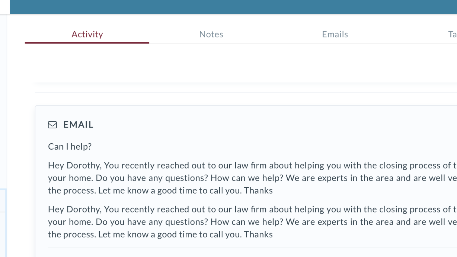 When potential clients contact your firm, it's easy to add them to the HubSpot CRM. The intake process lets you specify any notes, requests, contact information, and more.