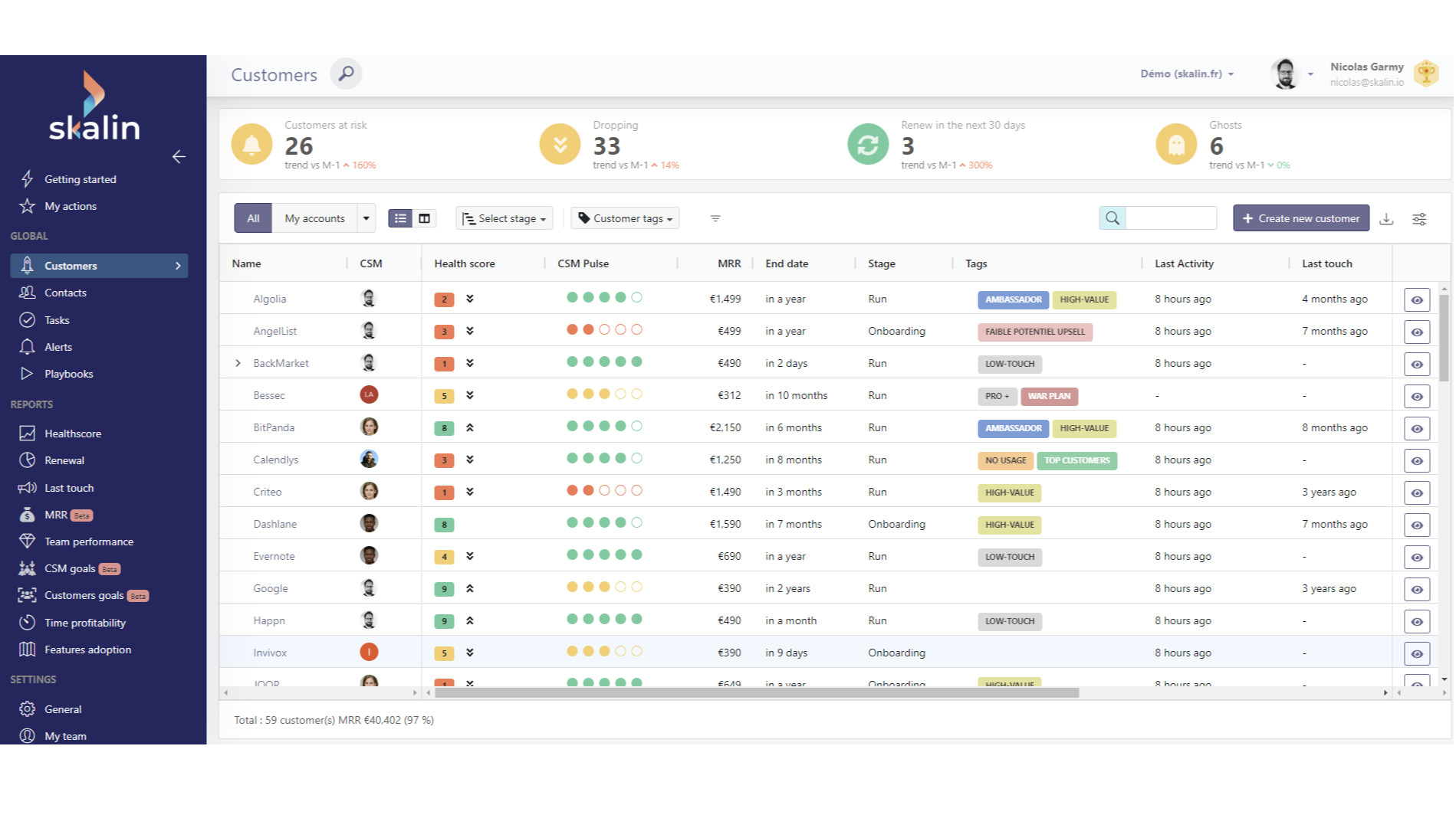 Skalin gives you a complete 360° view of your customers by aggregating data from all your tools — including HubSpot Data, product usage, subscription details, conversations, and more. Our HubSpot integration ensures your Customer Success and Sales teams stay perfectly aligned and can act faster on customer insights.