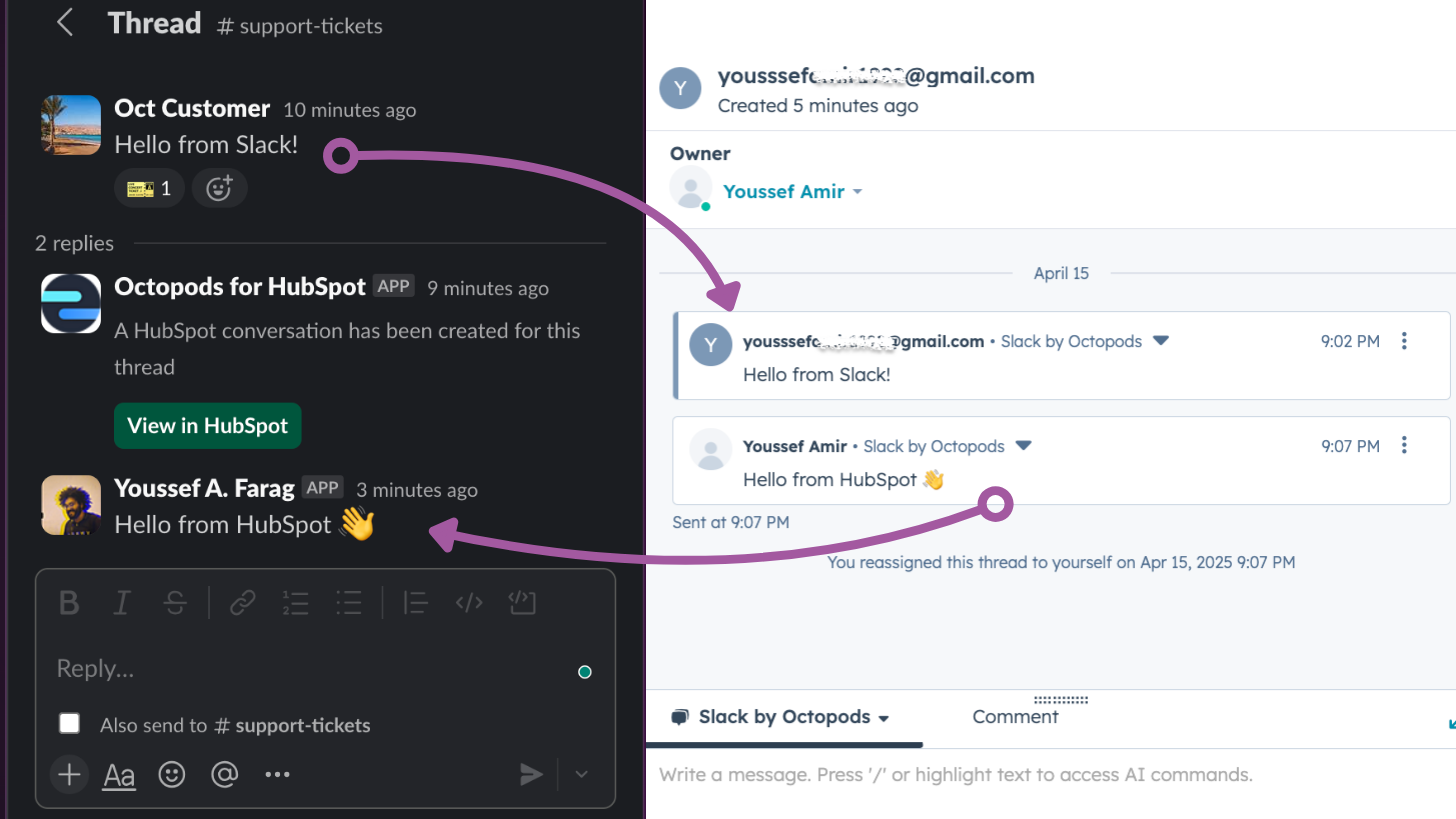 Seamless hand-offs – Mention a teammate or reassign the chat in HubSpot; Octopods echoes the update back to Slack so customers stay in the loop.