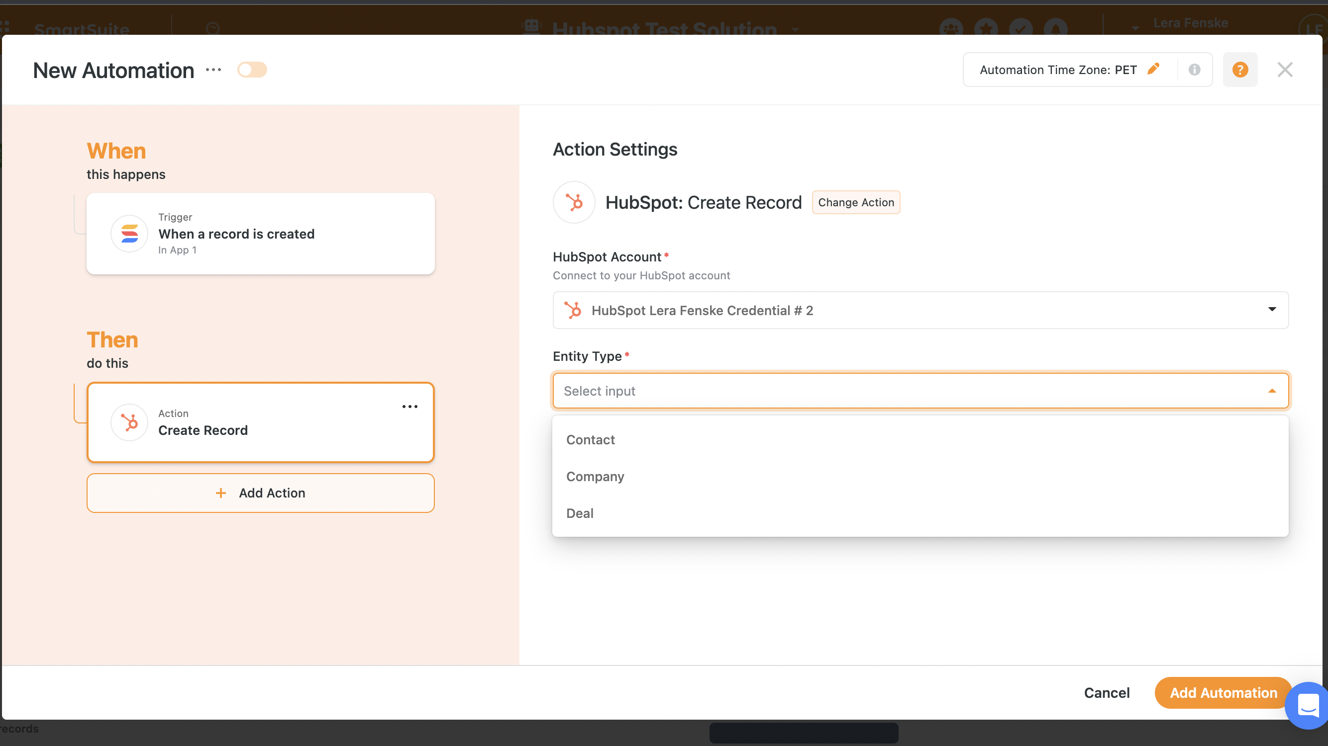 Automation actions would allow to Create records in HubSpot based on a trigger from inside SmartSuite.