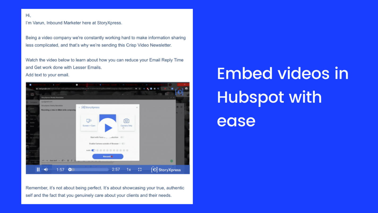 Time to redefine your lead generation strategy with StoryXpress Videos. Make your conversations more personalised by easily adding videos in conversations, 1:1 emails or campaign emails. Get to know your customers in a better way by tracking their video engagement. And access all your contact details from HubSpot as the leads captured on StoryXpress will be added to the HubSpot contacts list, along with its activities which help to gather engagement details about the customer.