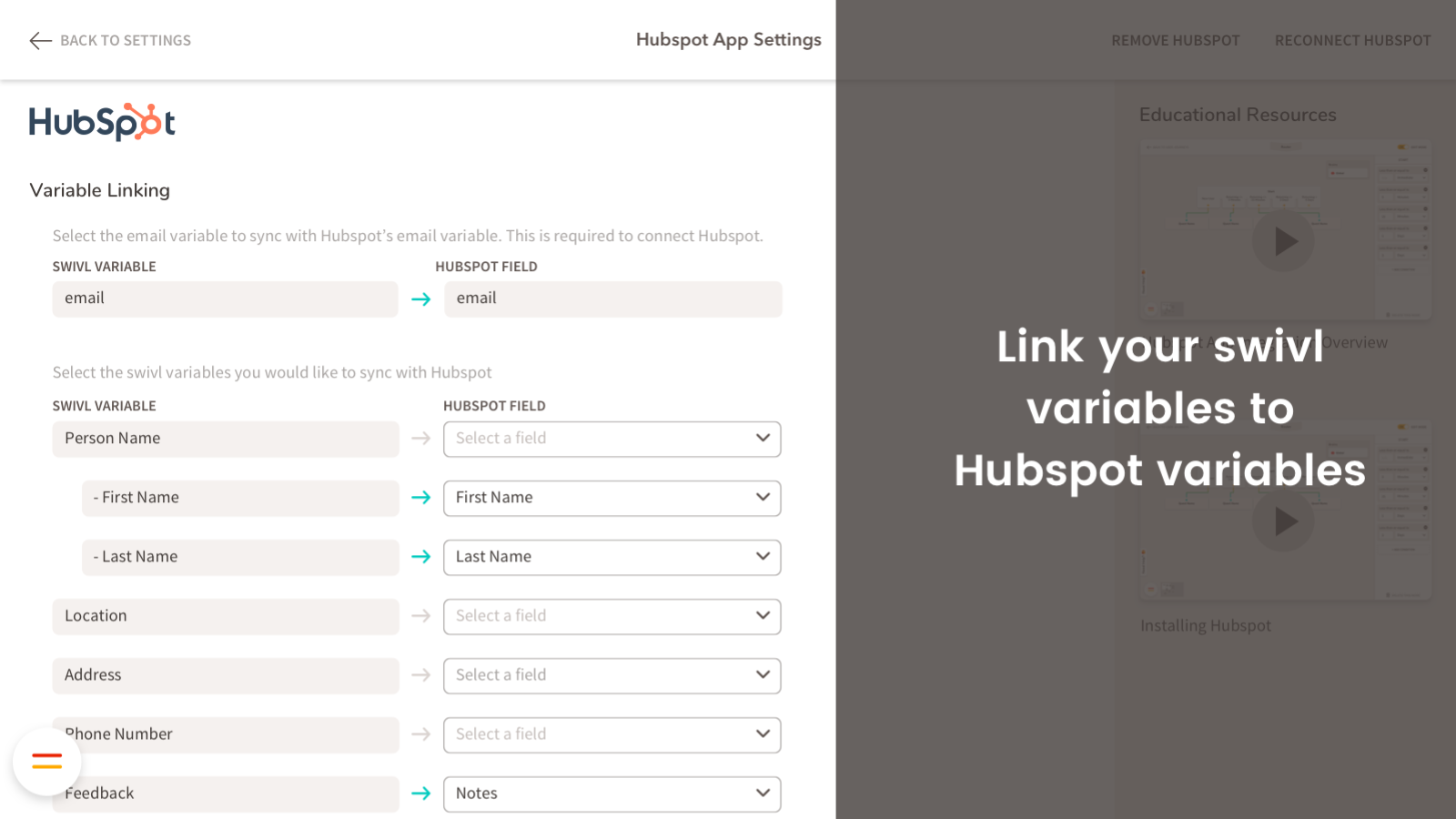 - Keep your CRM up to date by automatically sending leads to HubSpot and syncing relevant information captured as they interact with swivl.