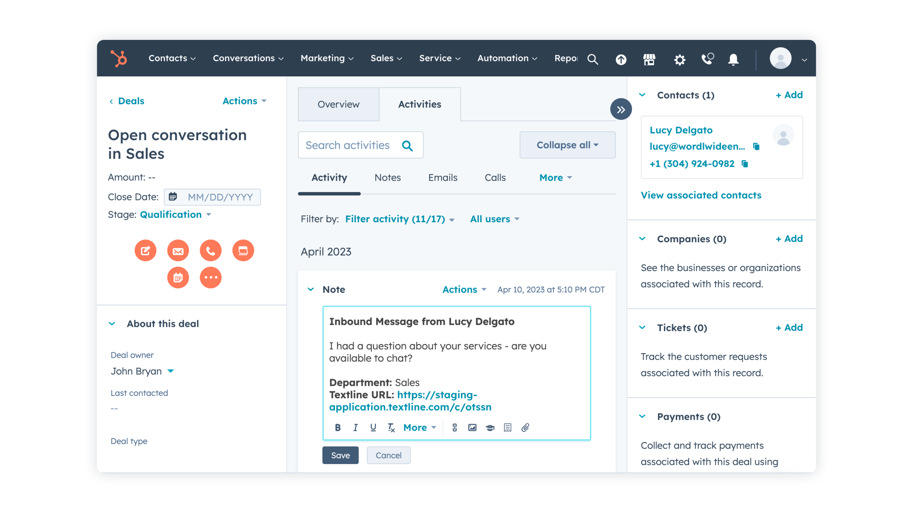 Always ensure you’re up-to-date on the latest text correspondence with each HubSpot contact. Text message history is logged as a contact note so your team can work smarter with enhanced visibility.