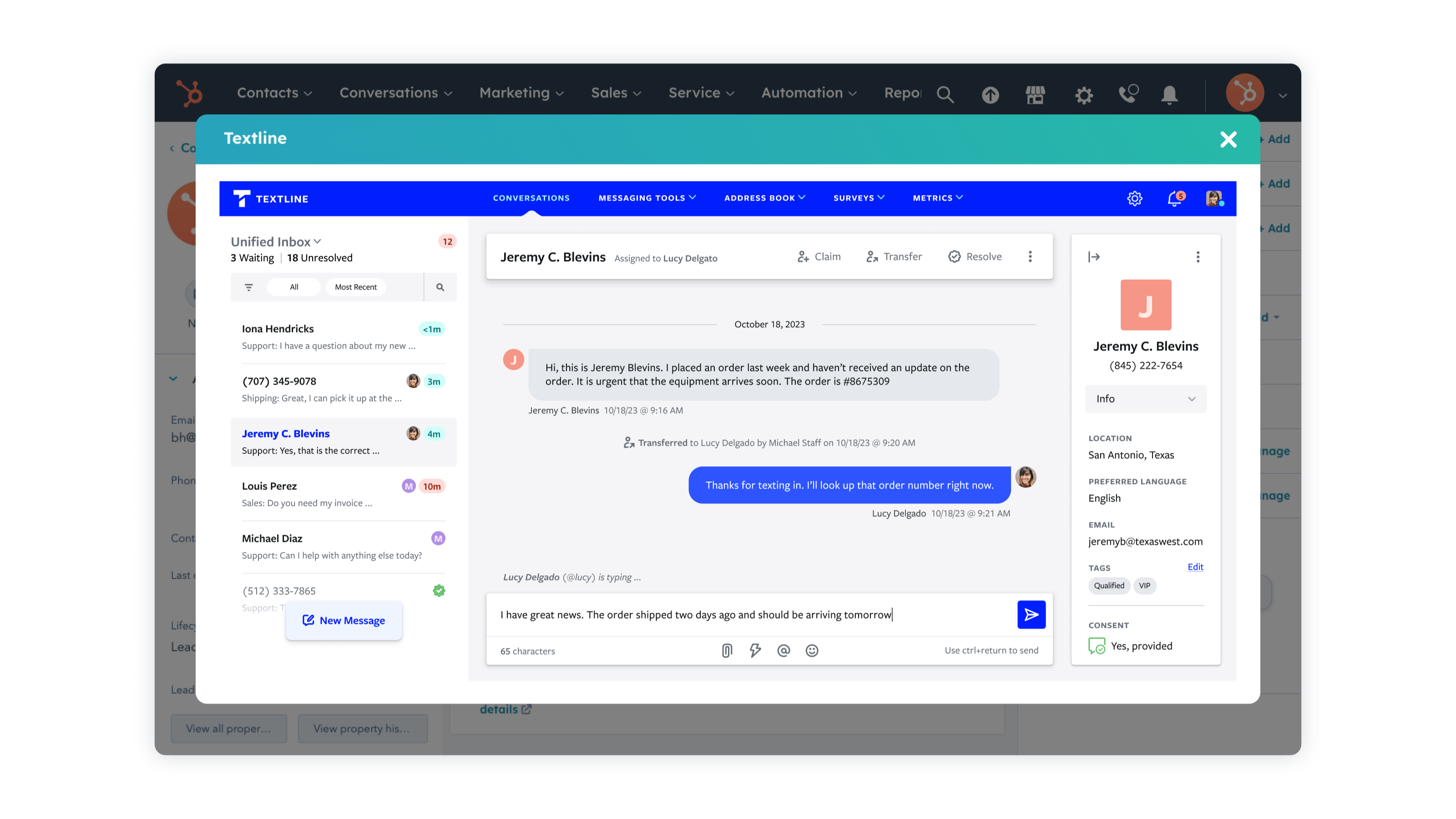 Textline helps businesses have one-on-one conversations with customers. With the Textline widget, you can text with customers directly from HubSpot without switching tabs. Plus as key data syncs between HubSpot and Textline, you can personalize your messages with ease.
