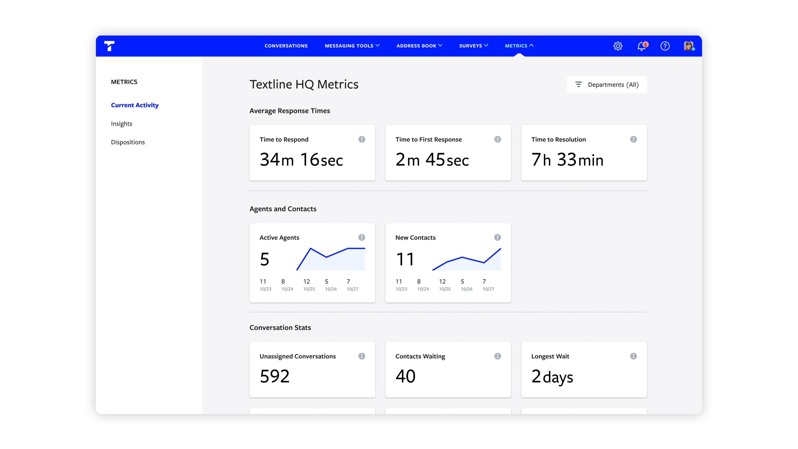 Textline equips teams with metrics to track performance and identify necessary improvements. You can view metrics like time to respond, time to resolve, unsubscribe rate, reply rate, and more.