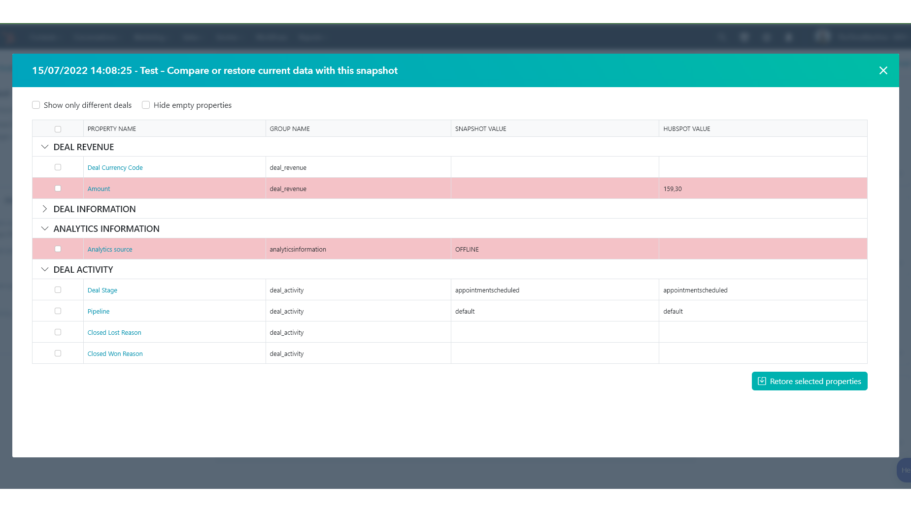 View on your screen a comparison between the current values and associations of the active deal with those of any of its copies.