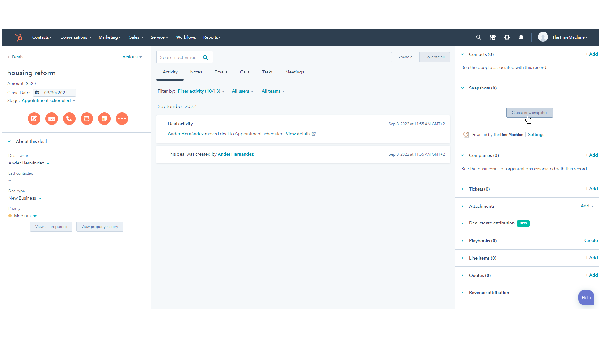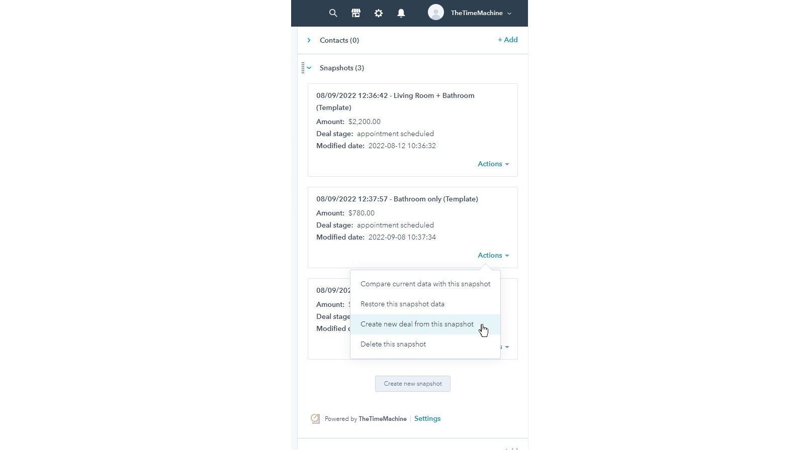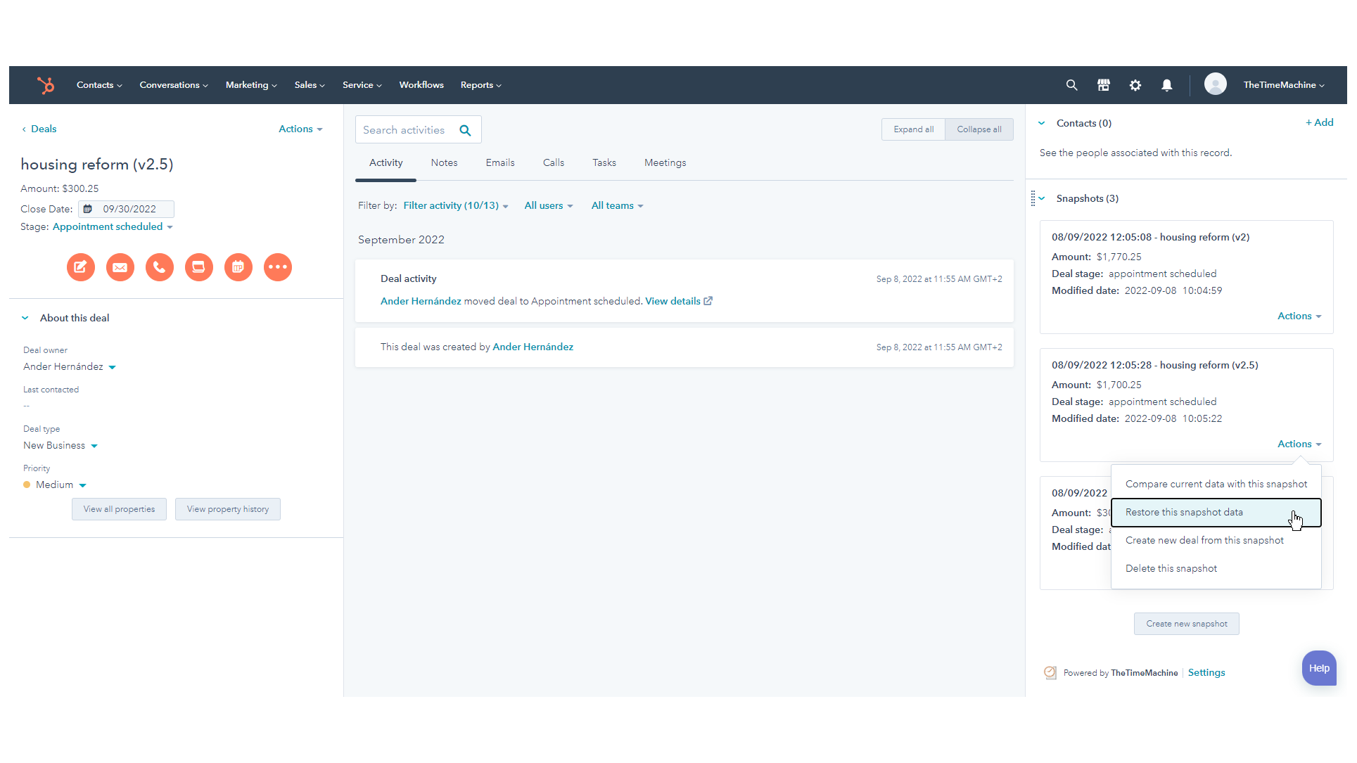 The Time Machine is a SAAS designed to make safety copies of a deal and its associated objects (lines of deals and quotations) and is able to restore the deal to a previous state or create a new deal from the copy.