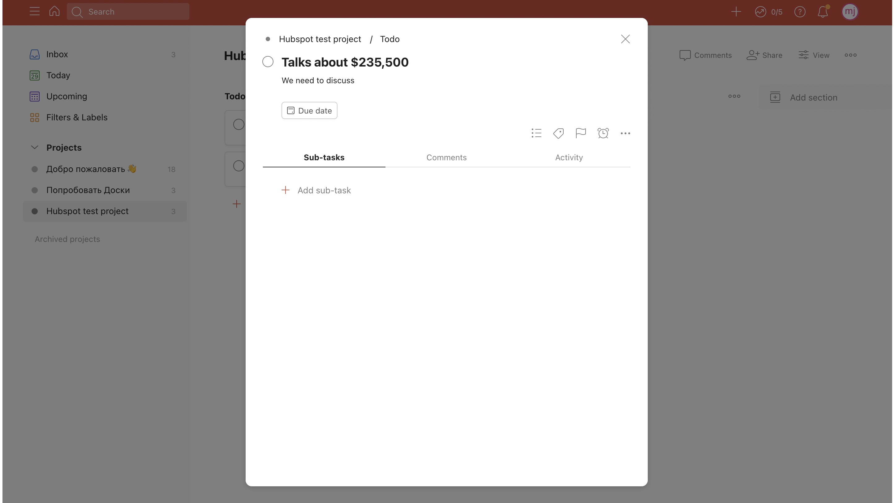 Add this action to create a new task on an existing Todoist board with HubSpot workflows. You can specify what event should trigger creating a new Todoist task and which Todoist project and section to add it to. For example, many teams use this feature to manage rep outreach and follow-ups.