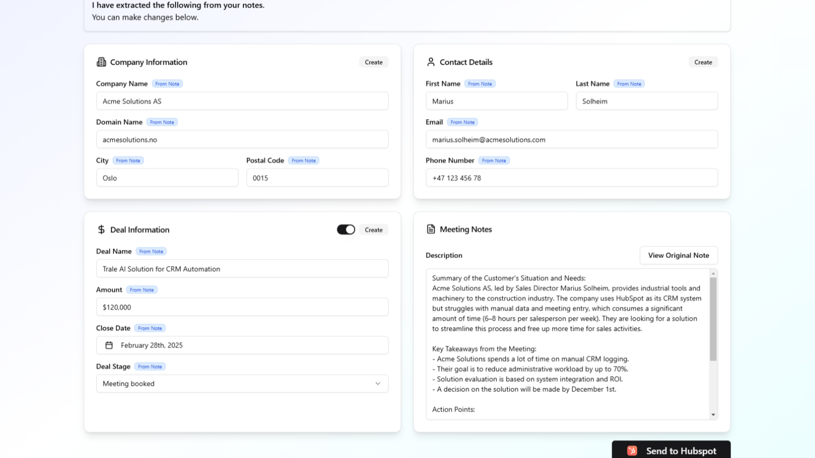 Trale uses meeting transcription and existing HubSpot data to generate a comprehensive meeting summary (including key takeaways, action points, and next steps). It also populates and updates all relevant fields in HubSpot—Company, Contact, Deal, and Notes—ensuring accurate and complete CRM records.