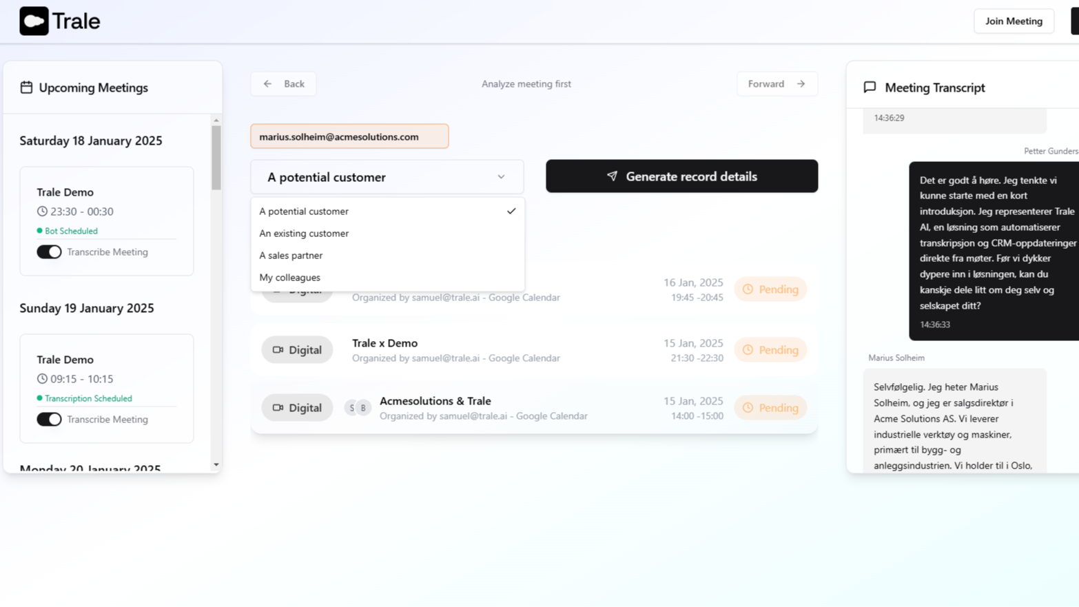 Different meetings require different insights. Select from 5 meeting types (Sales Call, Customer Call, Partner Call, Project Meeting, Internal Meeting) to ensure Trale tailors the summary and CRM updates to the specific context.