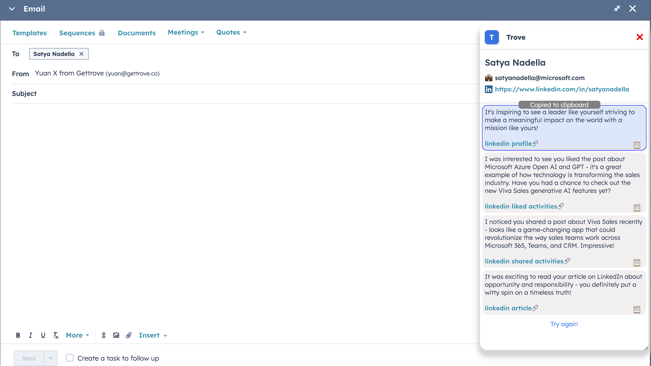 By installing the Trove chrome extension, you can have first lines generated based on your CRM contact data. We also enrich the contact behind the scene, feed realtime events into state of the art AI, and deliver first lines right within your CRM page.