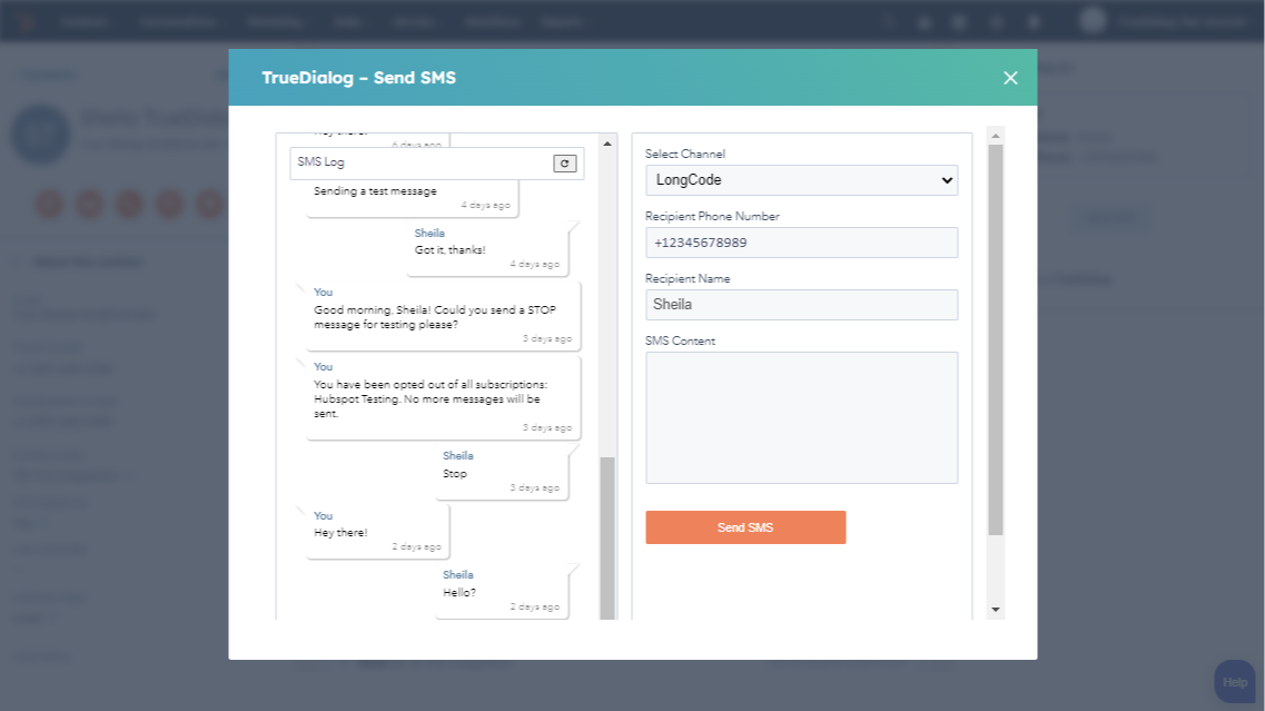 A HubSpot user is able to send an SMS directly to a Contact natively from HubSpot. For a single SMS, the user will select a Long Code channel, compose, and send SMS, all from the Contact record within HubSpot. Additionally, the user is able to see the log of messages from this interface.