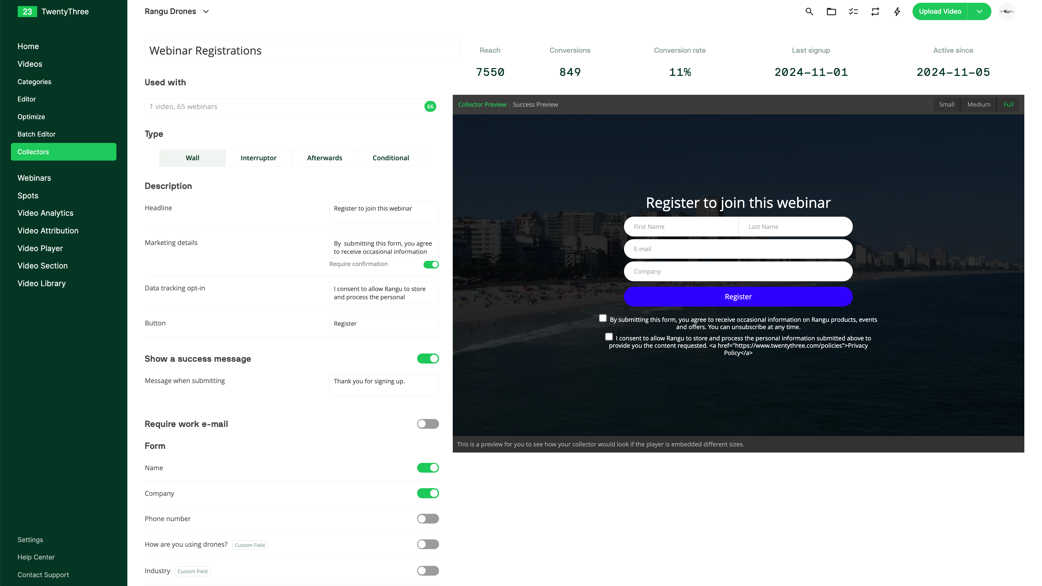Take control of your marketing videos and webinars to increase engagement, improve SEO, track your audience and eliminate third-party services by having videos and webinars directly on your website. The integration also lets you host videos with a leading 4K HD Player, generate leads from Collectors, and build customized video hubs and landing pages.