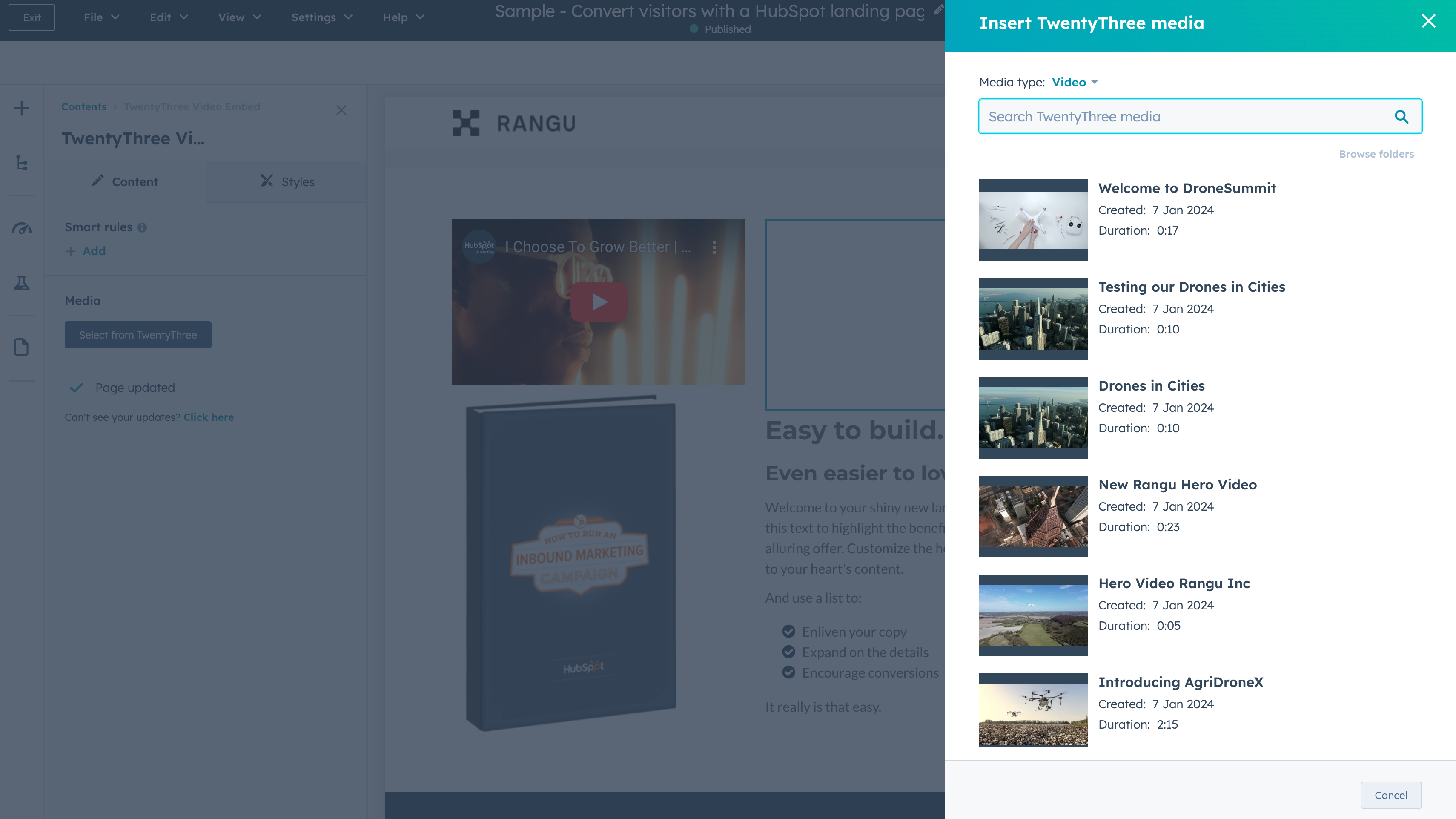 Now with Media Bridge you can drag and drop videos from TwenyThree directly into your landing pages when building them out in HubSpot.