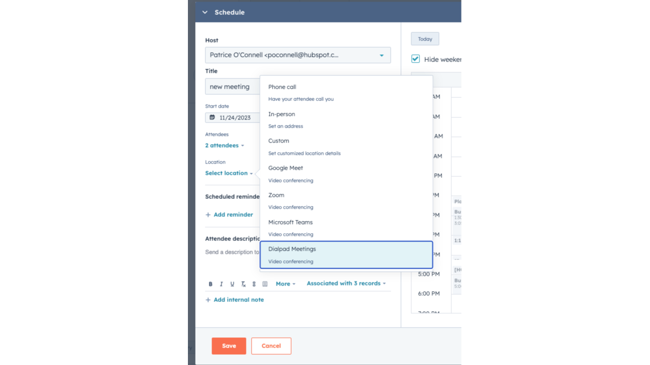 Schedule calls to your HubSpot prospects directly from their contact record. Easily specify that date, time, length, and attendees to your call and turn every meeting booked in your HubSpot CRM into an Dialpad Meetings meeting.