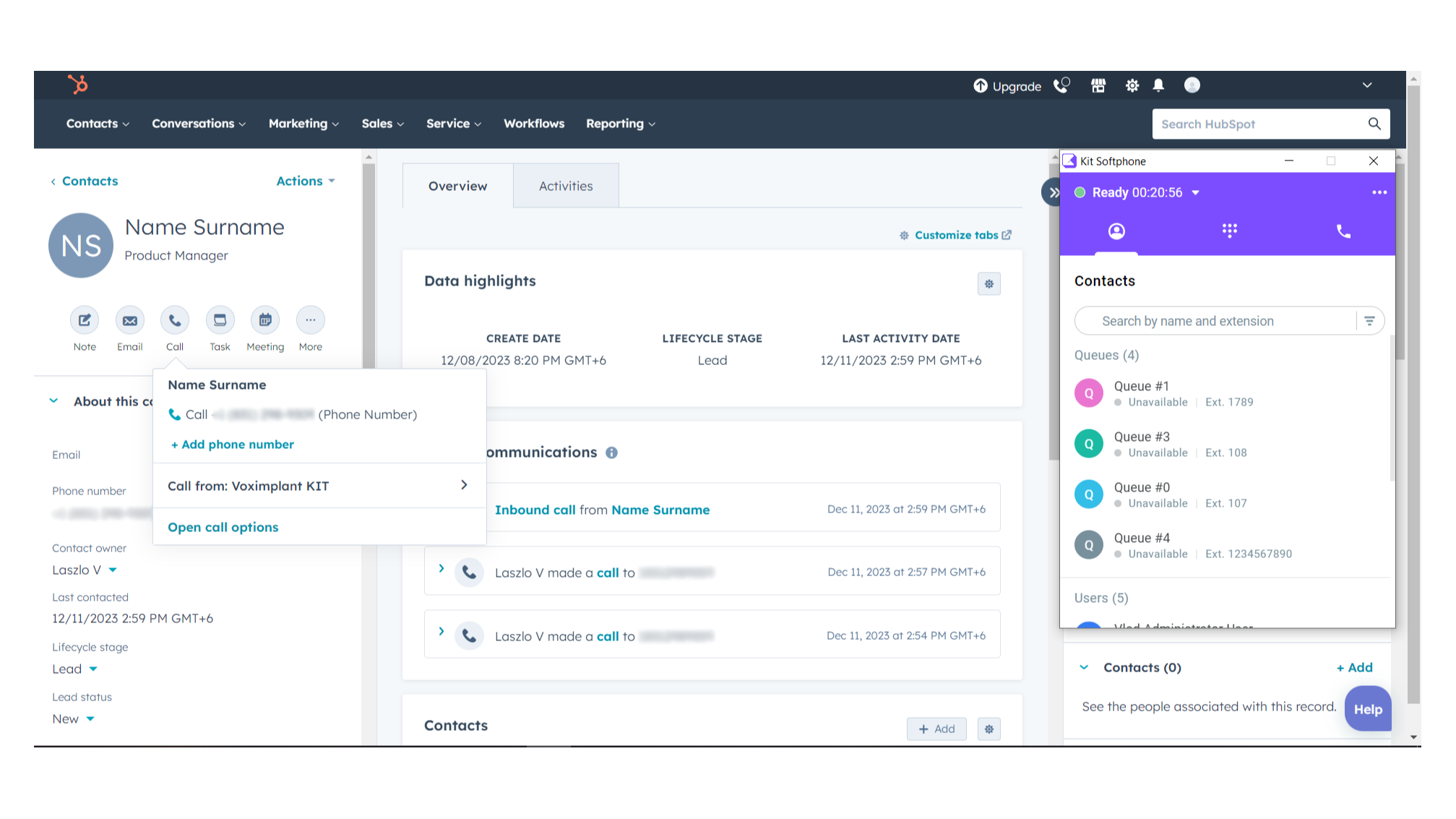 Voximplant Kit is an omnichannel contact center with no-code AI and a flexible voice-activated IVR. It can transform your contact center and integrate with your existing solution. Connect your Voximplant Kit account to HubSpot and manage customer calls directly from the HubSpot space. Use the click-to-call function to call customers via the Voximplant Kit softphone and associate calls with your contacts in HubSpot.