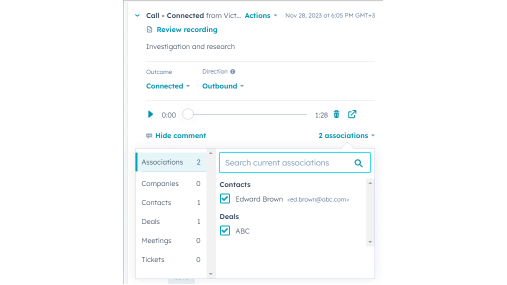 Create call logs in the required entities, such as contacts, companies, deals, or tickets.