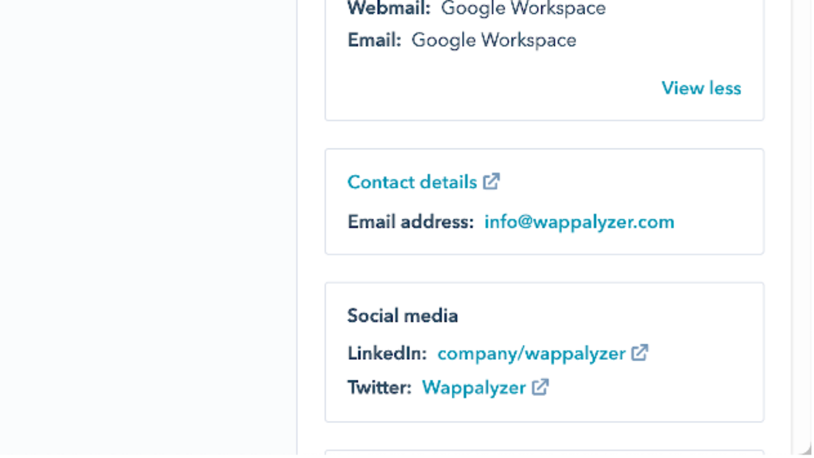 In addition to technologies, email addresses, phone numbers and social media profiles found on websites' contact pages are also displayed, along with website meta data such as title, description, country and language.