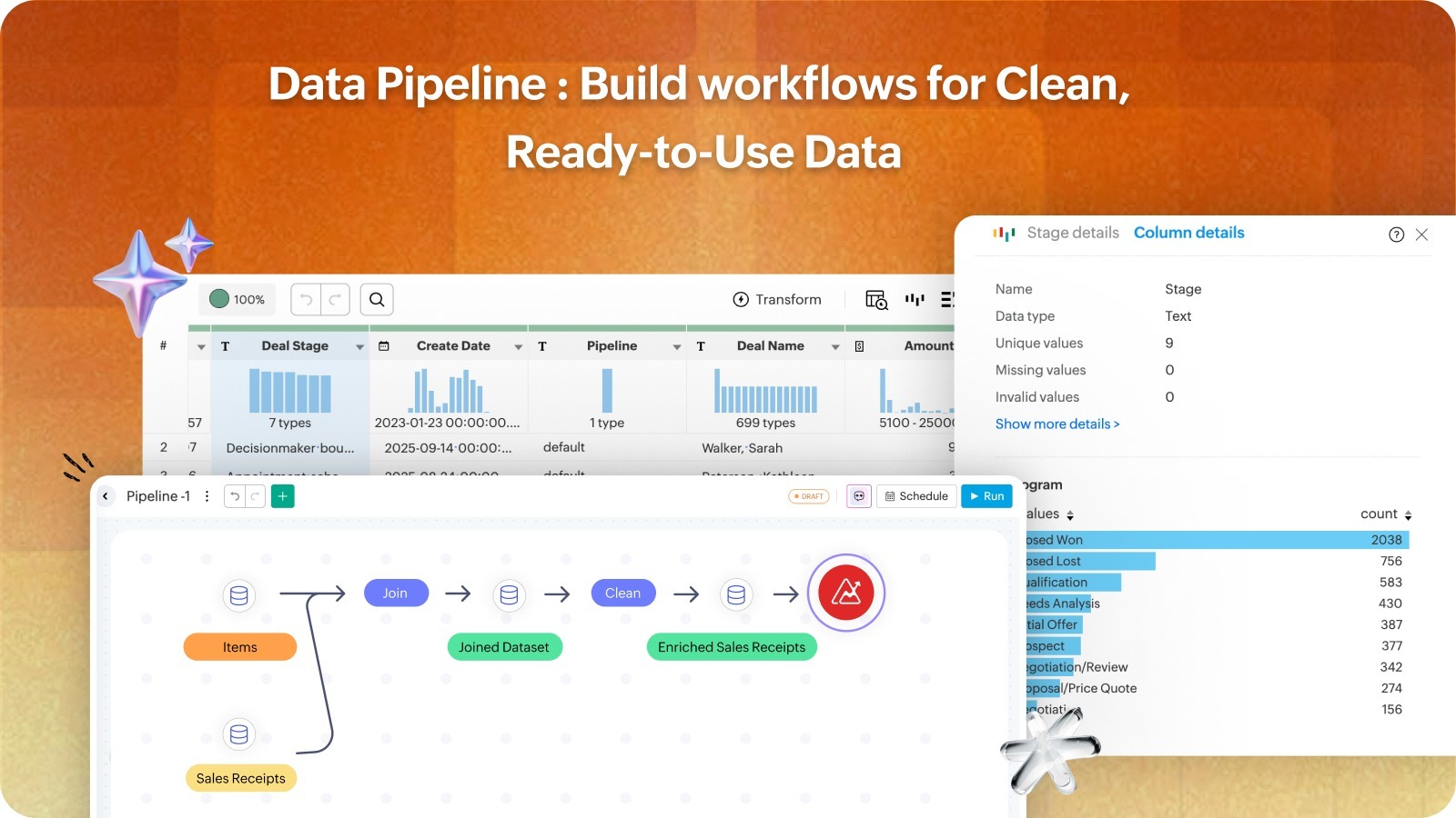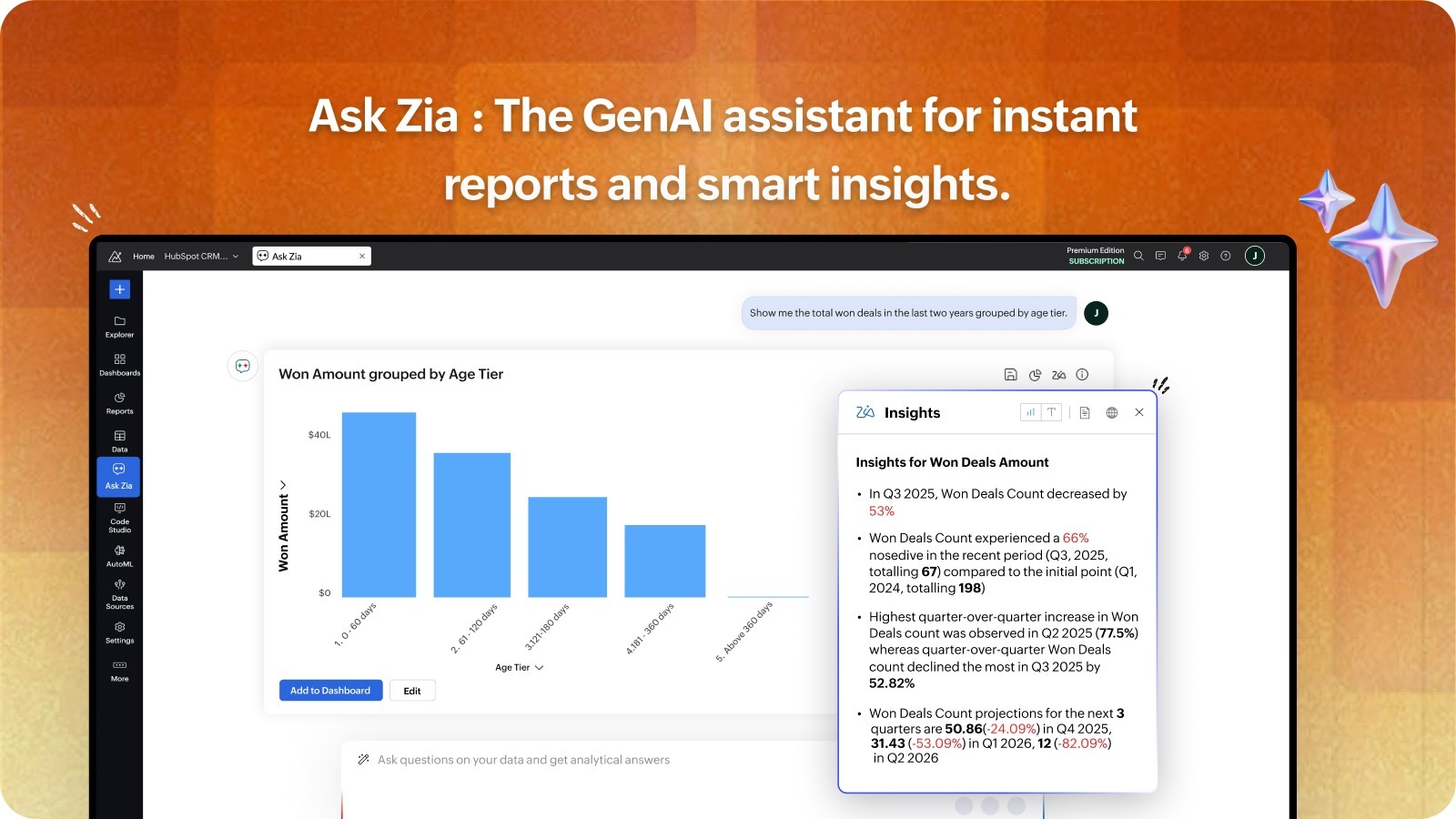 Build data pipelines to integrate, clean, prepare, transform, and enrich HubSpot CRM and Marketing data automatically. With agentic Ask Zia, you can define or modify pipeline steps and transform or enrich the data using natural language. Extract insights from 100+ hand-picked, ready-made reports that give you insights on key metrics.