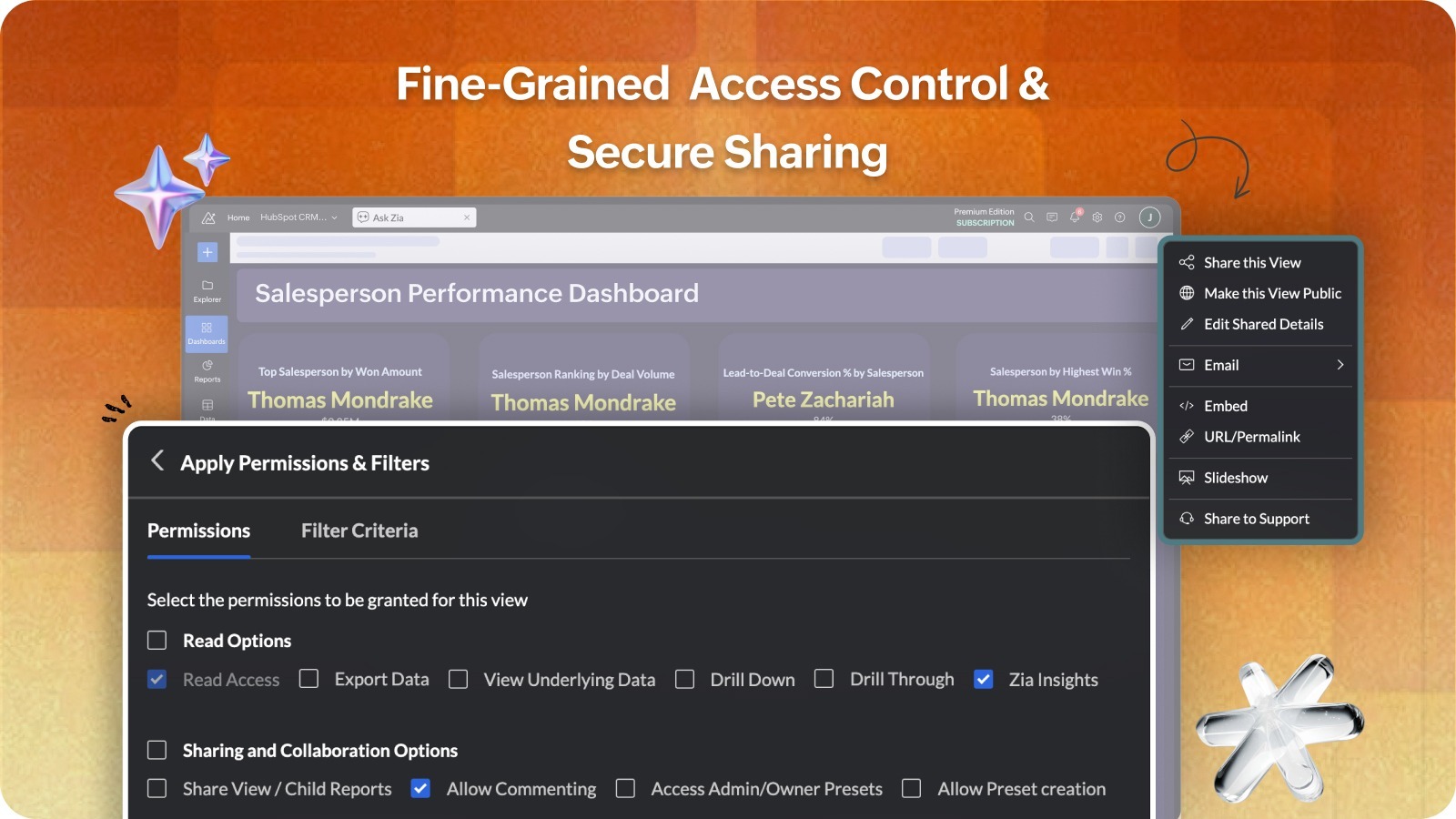 Zoho Analytics offers fine-grained access controls, allowing users to have full control over what they share with peers. Permissions for sharing include read-only, drill-down, export, or full report authorization. Users can also schedule reports and dashboards for automatic email delivery.